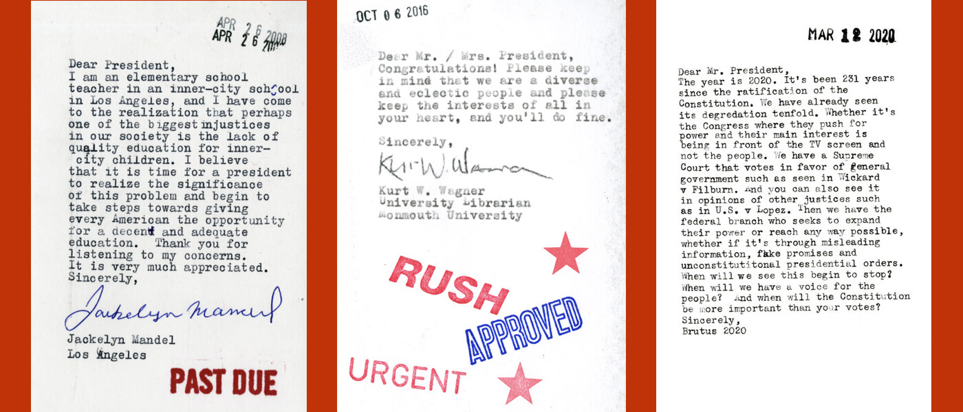 With backgrounds in journalism and fine art, Sheryl Oring began her ongoing project I Wish to Say in 2004 from a concern that many people’s voices were not being heard. She started to take dictation from the public about what they wanted to say to the (next) President. Dressed as a 1960s secretary with a typewriter, she records whatever participants say onto a postcard, making copies with carbon paper. During larger events, a secretarial bank takes dictation. Oring mails the postcards to the White House and exhibits copies. To date she has mailed over 4100 postcards.