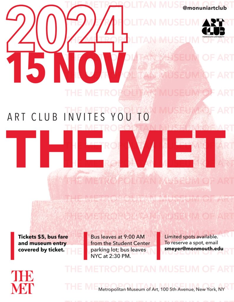 The Department of Art & Design and Art Club are sponsoring a trip to The Metropolitan Museum of Art in NYC on Friday November 15. All Monmouth students are invited to attend. The $5 fee will cover bus fair and museum entry. The bus will depart from Monmouth at 9:00am and depart The Met at 2:30pm. Email smeyer@monmouth.edu to secure a spot.