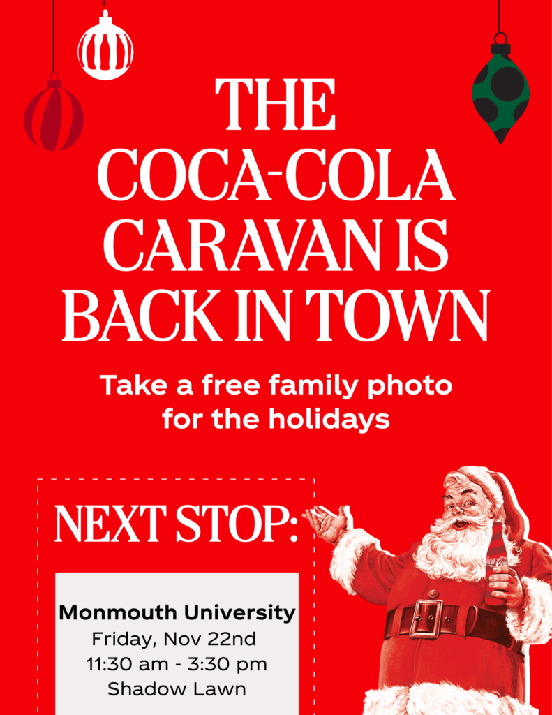 The Coca Cola Caravan is coming to Monmouth University on Friday, November 22 from 11:30 am to 3:30 pm in front of the Great Hall. The Coca-Cola Holiday Caravan, a festive red truck decorated with lights and carrying the iconic Santa Claus, traveled across Coke Consolidated territory, bringing happiness and cheer to local communities. At each stop, the Coca-Cola Caravan offers free sample tastings of Coca-Cola products, including Coca-Cola Zero Sugar and Coca-Cola Classic. Visitors also enjoyed festive music and had the opportunity to take family photos with Santa Claus.
