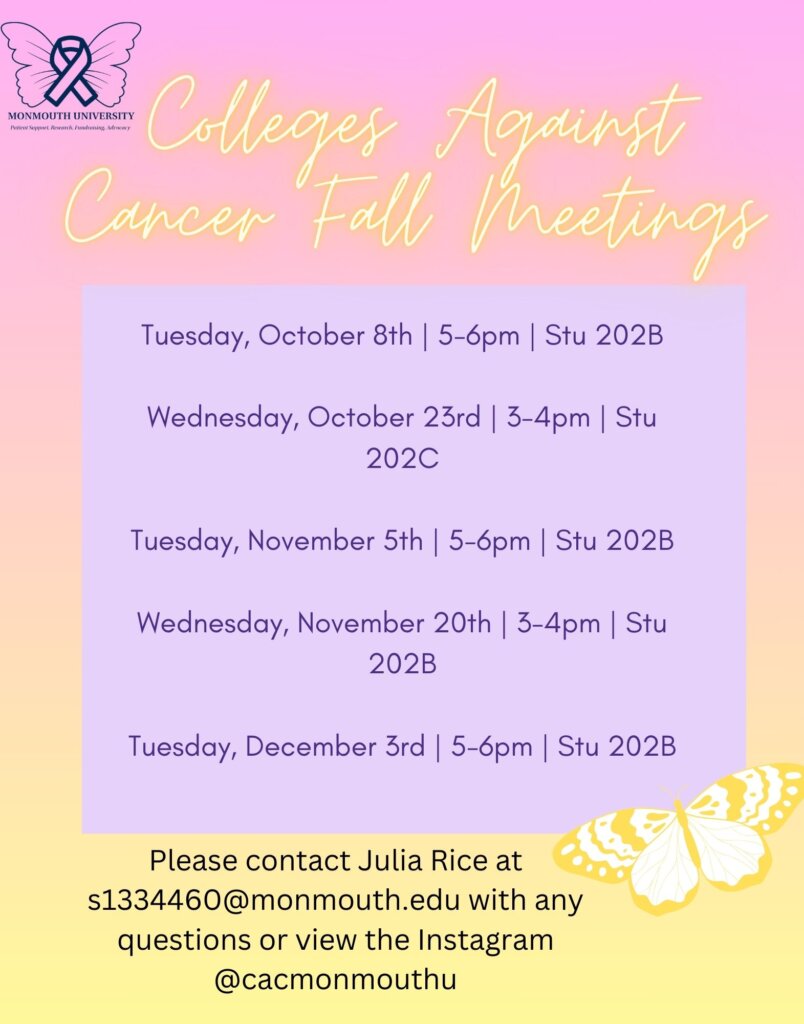 Colleges Against Cancer is accredited by the American Cancer Society, whose competencies include research, fundraising, advocacy for cancer awareness. We support those at Monmouth University and surrounding areas with different events hosted in and around campus, as well as co-sponsoring with other organizations on and off campus.