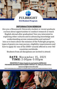 Are you a Monmouth University student or recent graduate curious about opportunities to conduct research or teach English abroad after graduation? Are you interested in exploring other cultures and in advancing knowledge and understanding across communities and nations? Join us to learn about the mission of the Fulbright program, types of grants you may pursue, eligibility requirements and how to apply for one of the 2000+ awards offered in over 140 countries worldwide. Students from all disciplines are invited to attend.
