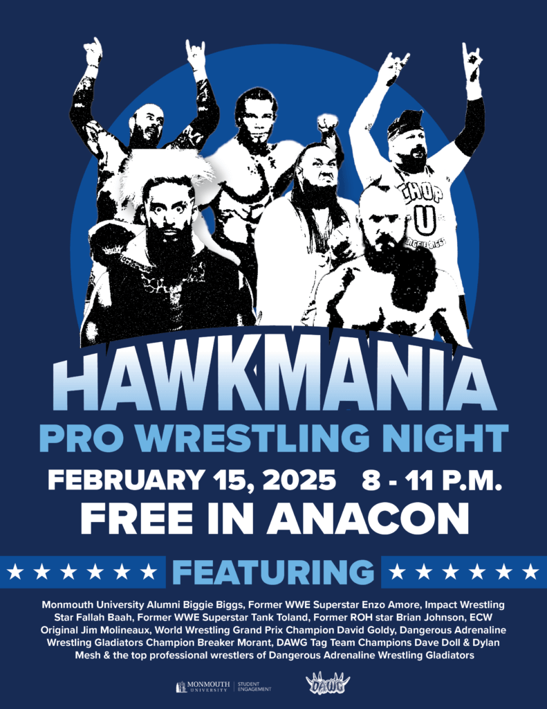 Get ready for an action-packed evening at HawkMania Pro Wrestling Night, where the fiercest wrestlers battle it out in the ring for ultimate glory! Join us for high-energy matches, thrilling moments, and unforgettable entertainment that will leave you on the edge of your seat! Saturday, February 15, 8 pm in Anacon Hall. Limited space, first come, first served!