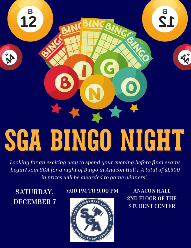 What better way to wrap up the fall semester than an end of the semester evening of bingo courtesy SGA. We’ll have $1,500 in prizes and all you need to do is show up. SGA will begin calling bingo games at 7:00 pm in Anacon Hall.