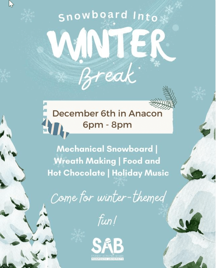 Join SAB on December 6 from 6pm – 8pm for a night of winter festivities! Enjoy holiday music, wreath making, food, a mechanical snowboard and more!