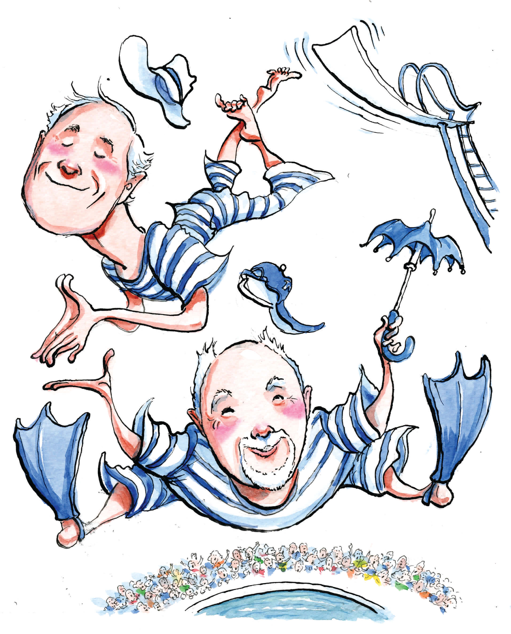It’s been almost five decades since Peter Bruckmann ’70 and Jeffrey Buchner ’71 last performed together, yet their faces still light up in unison as they recall their old clown diving routines. “It was slapstick, almost like old vaudeville,” Buchner says of the performances he and Bruckmann put on at aquatic events on campus and throughout the tristate area between 1967 and 1970.