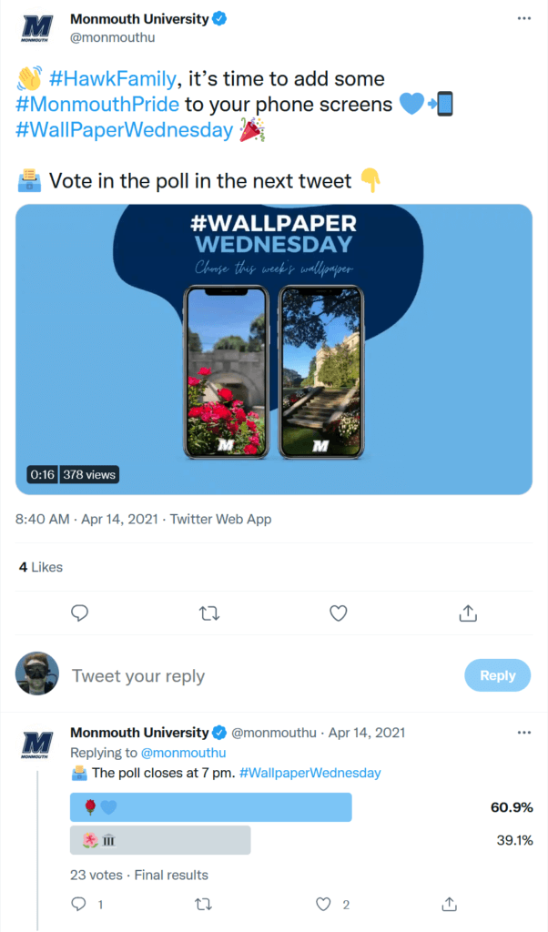 Use the Monmouth community to your advantage by mentioning other Monmouth-related accounts. For example, including @monmouthu, #HawkFamily, or other related University accounts can help amplify your message.