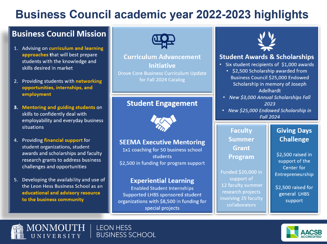 The council consists of current and retired businesspeople with extensive backgrounds across business sectors. They provide students with career mentoring, experiential learning opportunities, and access to high quality networking.