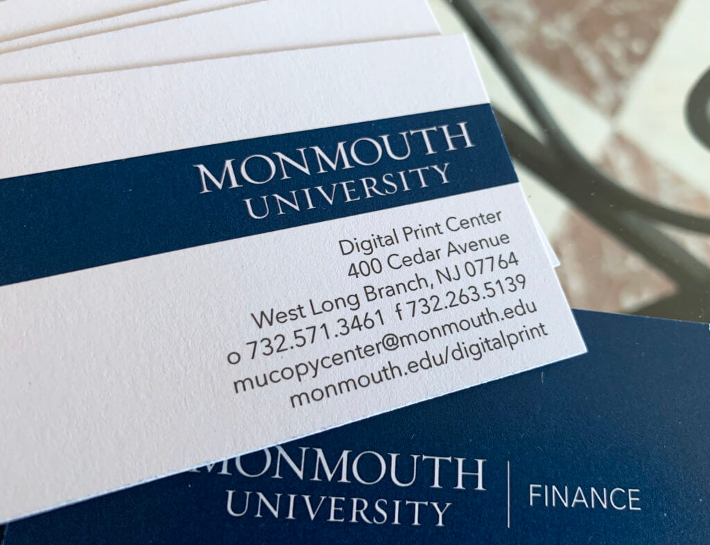 The University has an approved design for all University stationery (letterhead, memo pads, business cards, etc.). This design incorporates our branding and the approved Monmouth University logo. Orders for all University stationery must be made through the Monmouth University Digital Print Center. If branding updates occur, you may need to order an updated version of existing stationery.