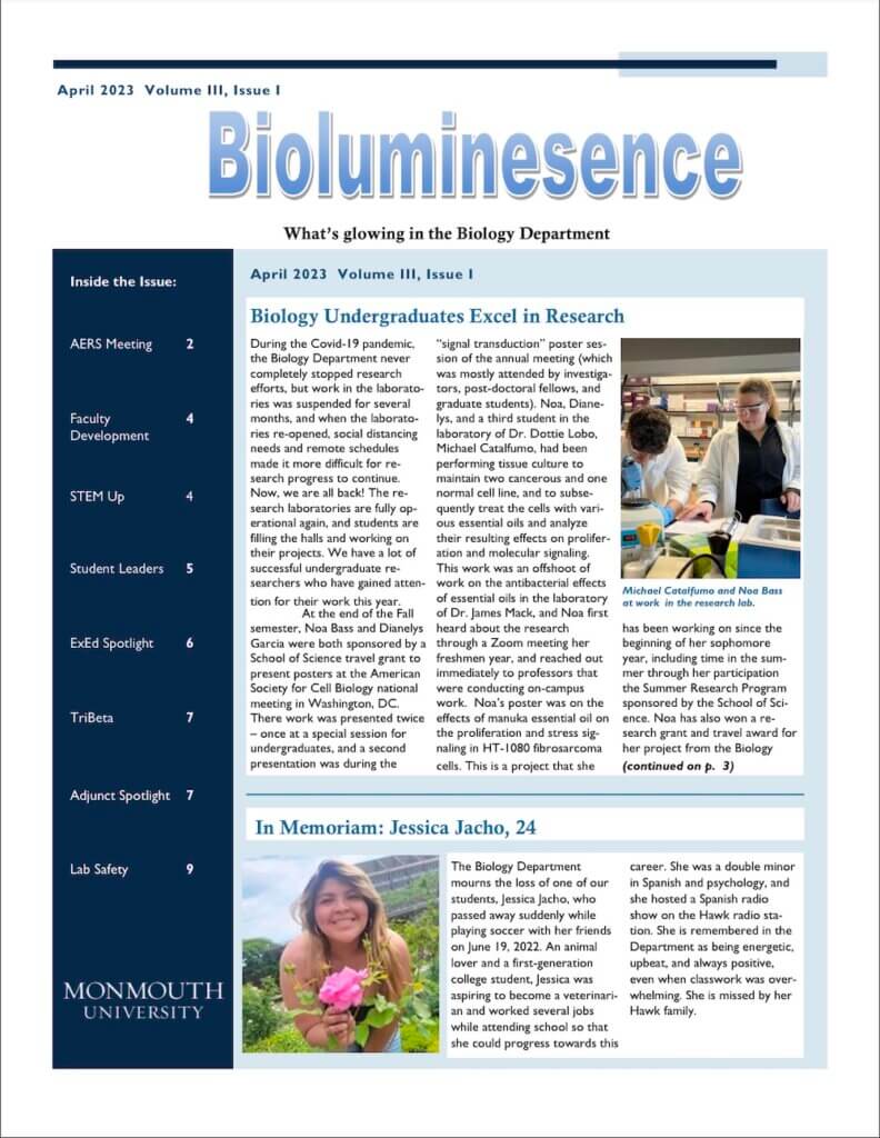 The Department of Biology within the School of Science provides students with a breadth of knowledge in the biological sciences. With the beaches of the Atlantic Ocean only one mile from campus, students are able to take advantage of these nearby “natural classrooms” and gain the knowledge and experience to meet future goals – including graduate or professional school, or career choices in fields such as medicine and teaching.