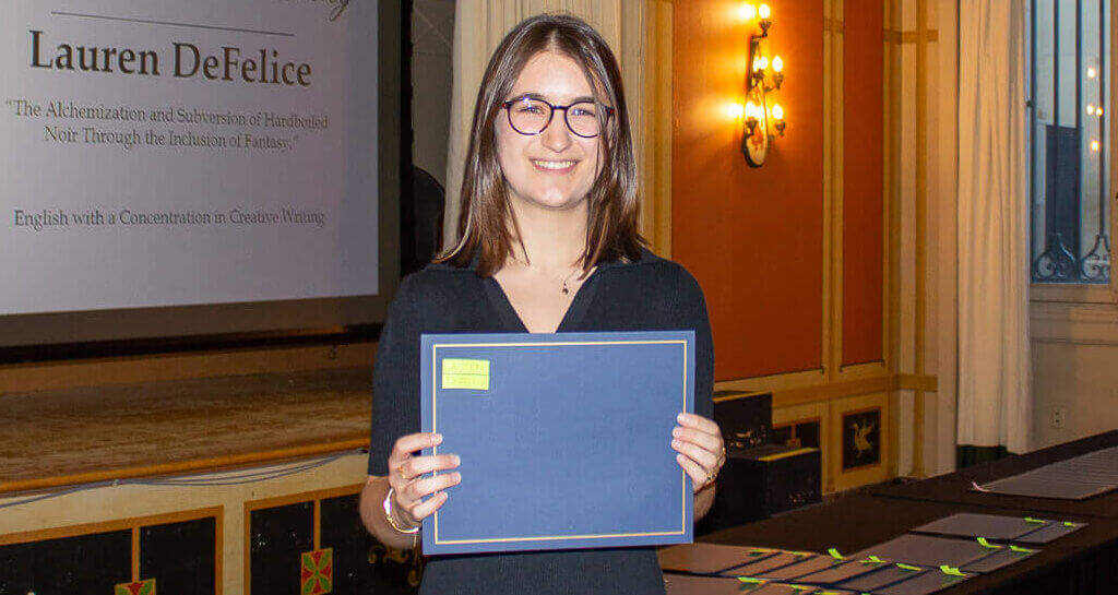 Lauren DeFelice is a graduating senior majoring in English with a concentration in Creative Writing. Inspired by her Independent Study in crime fiction, her paper “The Alchemization and Subversion of Hardboiled Noir Through the Inclusion of Fantasy” explores the validity of the feminine in matters of deduction. Alongside her degree at Monmouth University, she is pursuing an Editing certification at the University of Chicago with a specialization in Developmental Editing for Fiction. She hopes to utilize her English education to work in the publishing industry, however, novel writing will always be her first love. She is now writing a novel for her undergraduate thesis about detectives who solve mysteries by entering people’s dreams. Lauren would like to thank the entire English Department for their encouragement of her academic pursuits, but she’d like to specially thank Dr. Womack and Dr. Starke for their readership and advice throughout the writing process of this paper and thesis. She plans to publish her thesis post-graduation and pursue a long-time dream of becoming a published novelist.