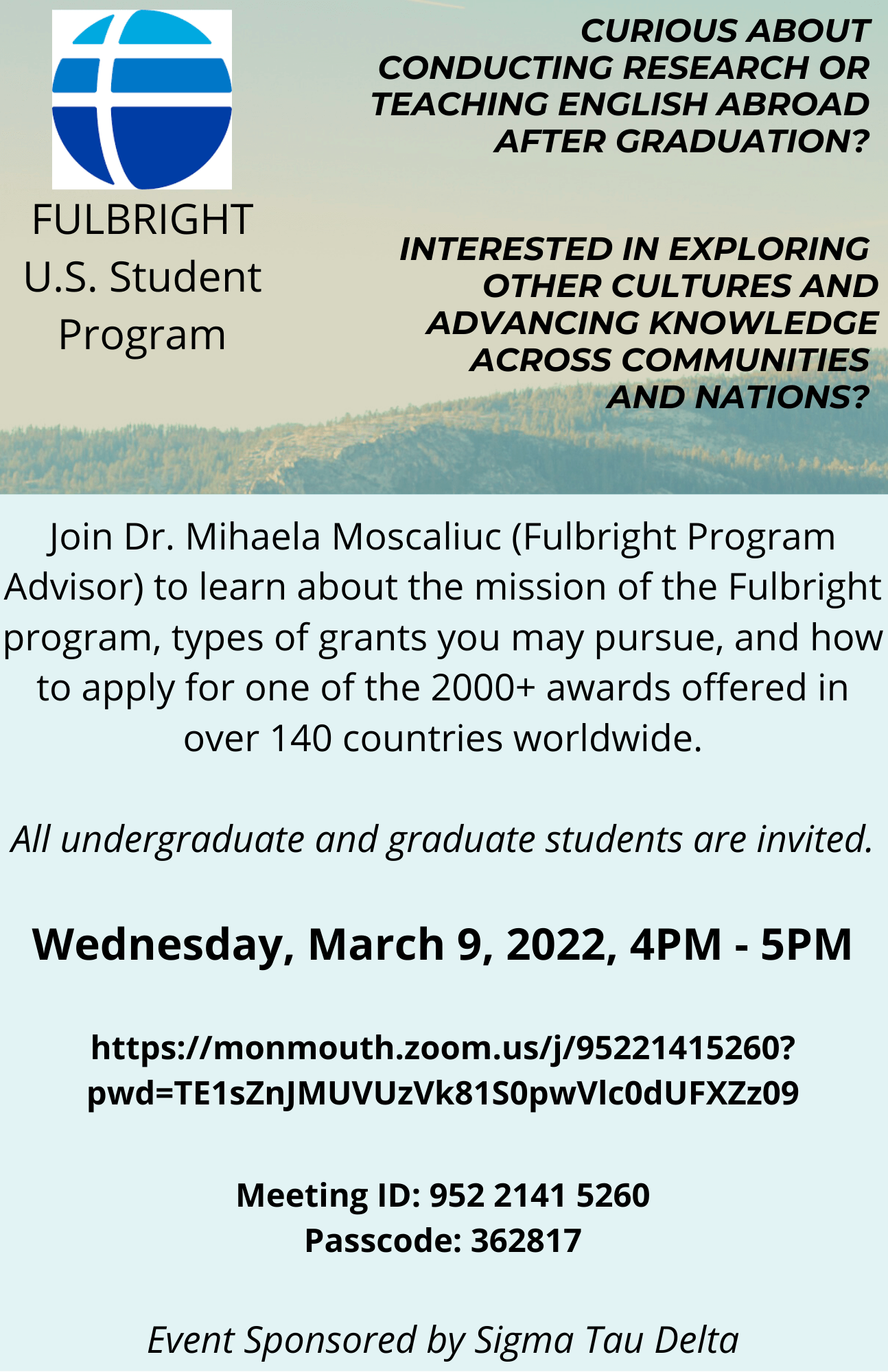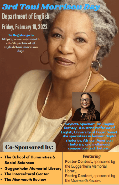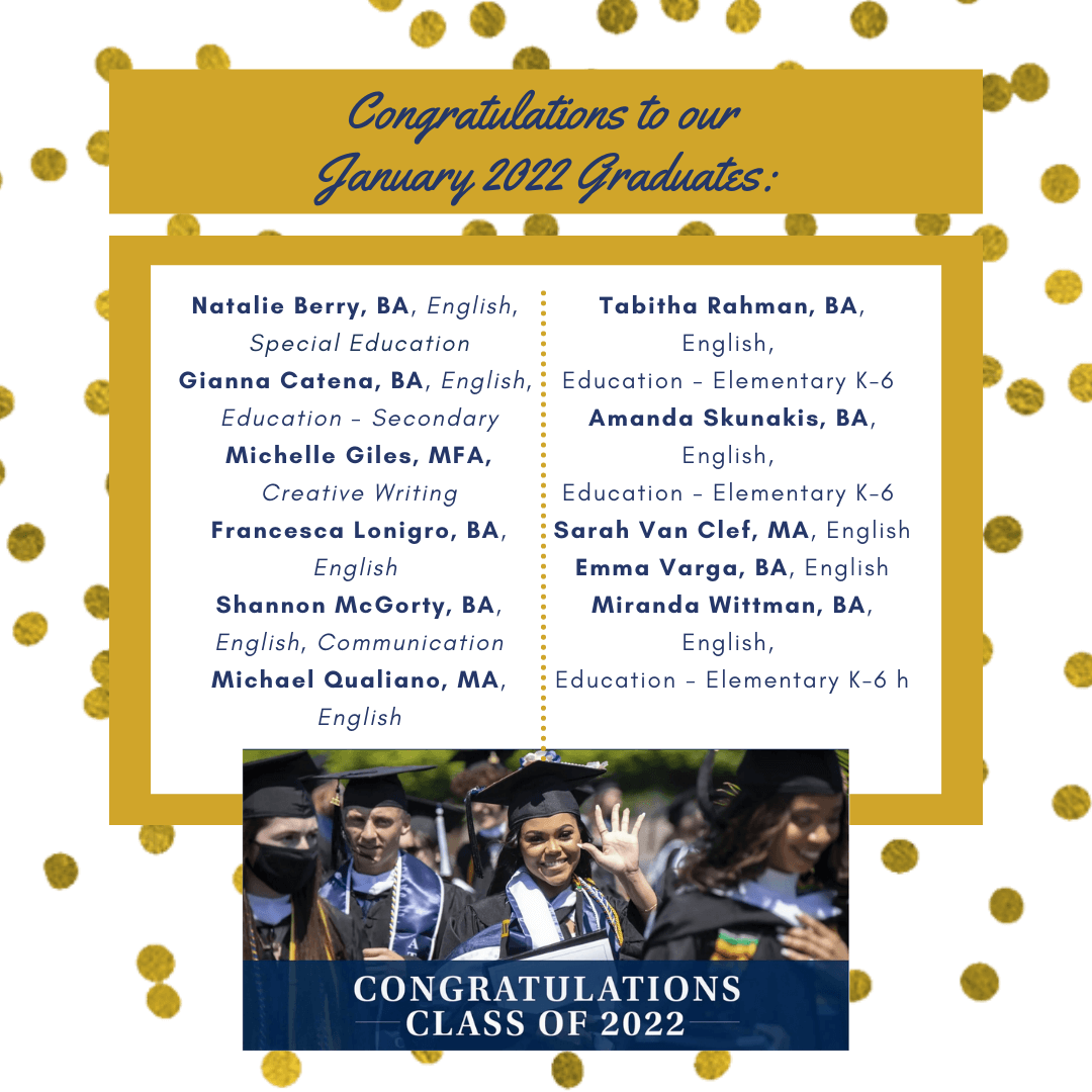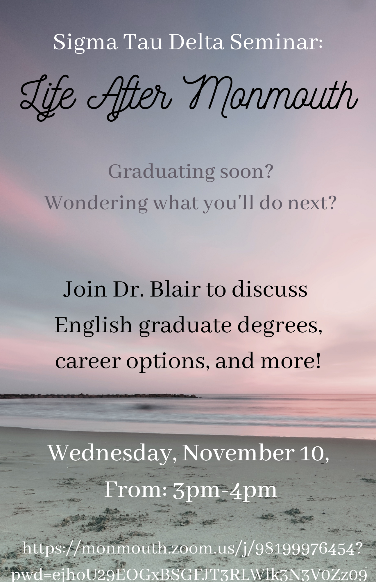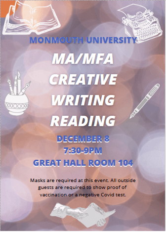 Summer Commencement, August 26, 2021Fall 2021 Classes begin on September 7th!Guest Poet Adrienne Su visited EN-615 (Craft Seminar), September 30Climate Crisis Teach-In, October 4-9. 2021 https://www.monmouth.edu/school-of-science/climate-crisis-teach-in/Climate Crisis Teach-In: Dr. Estes presented “Climate Rhetoric: Student Panel in History of the English Language,” October 5.Climate Crisis Teach-In: Drs. Estes and Jackson participate in the “Incorporating Environmental Readings in Literature Courses: LIT Faculty Workshop”, October 8, 2021Fall Undergraduate Open House, October 10“Life After Monmouth” Workshop Series, facilitated by Dr. Blair, November 10, 2021The Interdisciplinary Conference on Race: Researching and Teaching on Race — 8:30 a.m. – 4:10 p.m., November 12, 2021 https://www.monmouth.edu/department-of-history-and-anthropology/interdisciplinary-conference-on-race/Sigma Tau Delta’s Double Good Popcorn Fundraiser, Monday, Nov. 29 through Friday, Dec. 3, 2021English M.A./M.F.A. Creative Writing Reading – 7:30-9:00 p.m., December 8, 2021Winter Commencement, January 14, 2022Toni Morrison Day, February 18, 2022 https://www.monmouth.edu/department-of-english/toni-morrison-day/Program details for Toni Morrison Day 2022 https://www.monmouth.edu/department-of-english/toni-morrison-day/“Fulbright U.S. Student Program” Workshop, facilitated by Dr. Mihaela Moscaliuc, March 9, 2022English Student Awards Ceremony and Sigma Tau Delta Induction, April 8, 2022Sigma Tau Delta presented “Living with Poetry: Reflection and Compassion in Everyday Life” with Prof. Thomas Thursday, April 21, 2022Special Earth Day Lecture, “Climate Crisis: What Can We Do?” taught by Heide Estes Friday, April 22, 2022 https://www.monmouth.edu/mca/series/adult-education-series/Student Scholarship Week 2022: “Open Classroom: Mapping Monmouth’s Linguistic Profile”, April 22, 2022oom: Mapping Monmouth’s Linguistic Profile, April 22, 2022 https://www.monmouth.edu/provost/student-scholarship-2022/Scholarship Week 2022: Graduate English Symposium, April 19, 2022 https://www.monmouth.edu/provost/student-scholarship-2022/