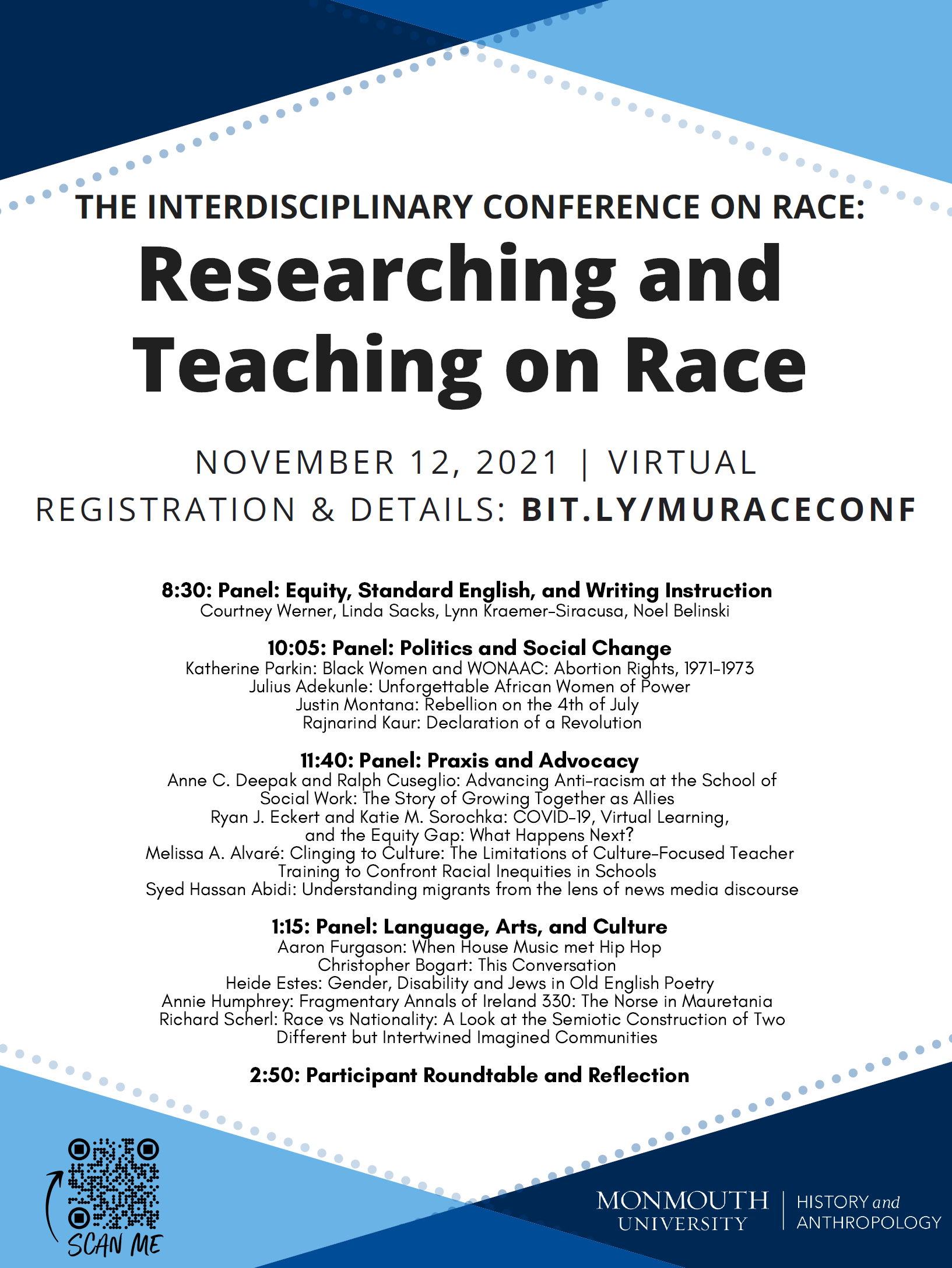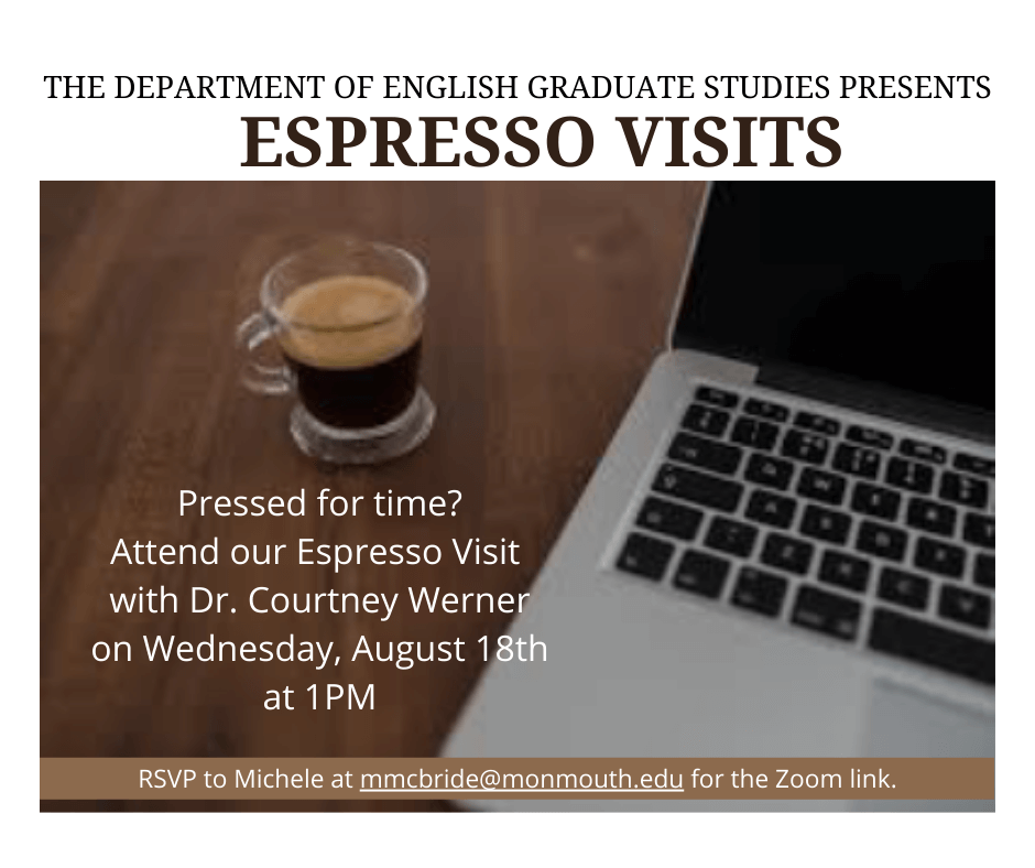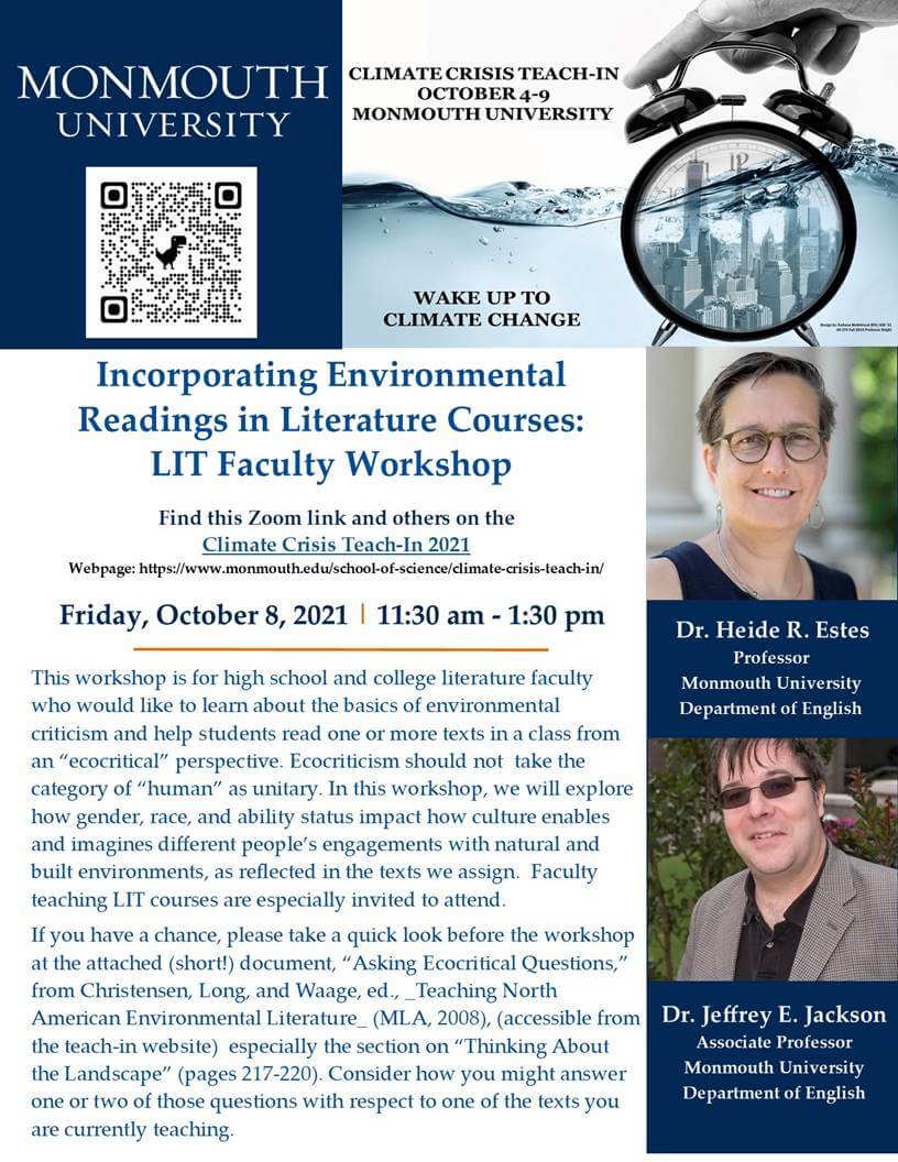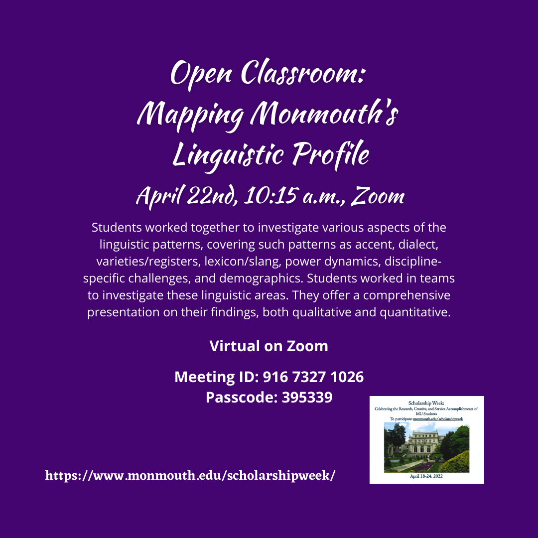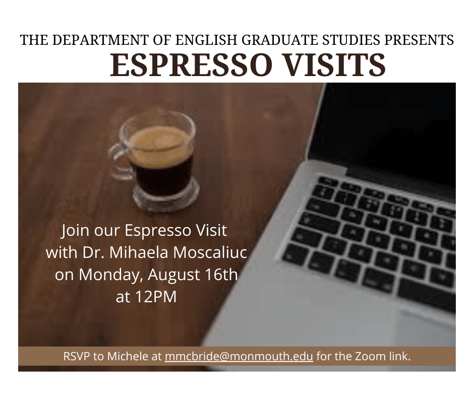 Summer Commencement, August 26, 2021Fall 2021 Classes begin on September 7th!Guest Poet Adrienne Su visited EN-615 (Craft Seminar), September 30Climate Crisis Teach-In, October 4-9. 2021 https://www.monmouth.edu/school-of-science/climate-crisis-teach-in/Climate Crisis Teach-In: Dr. Estes presented “Climate Rhetoric: Student Panel in History of the English Language,” October 5.Climate Crisis Teach-In: Drs. Estes and Jackson participate in the “Incorporating Environmental Readings in Literature Courses: LIT Faculty Workshop”, October 8, 2021Fall Undergraduate Open House, October 10“Life After Monmouth” Workshop Series, facilitated by Dr. Blair, November 10, 2021The Interdisciplinary Conference on Race: Researching and Teaching on Race — 8:30 a.m. – 4:10 p.m., November 12, 2021 https://www.monmouth.edu/department-of-history-and-anthropology/interdisciplinary-conference-on-race/Sigma Tau Delta’s Double Good Popcorn Fundraiser, Monday, Nov. 29 through Friday, Dec. 3, 2021English M.A./M.F.A. Creative Writing Reading – 7:30-9:00 p.m., December 8, 2021Winter Commencement, January 14, 2022Toni Morrison Day, February 18, 2022 https://www.monmouth.edu/department-of-english/toni-morrison-day/Program details for Toni Morrison Day 2022 https://www.monmouth.edu/department-of-english/toni-morrison-day/“Fulbright U.S. Student Program” Workshop, facilitated by Dr. Mihaela Moscaliuc, March 9, 2022English Student Awards Ceremony and Sigma Tau Delta Induction, April 8, 2022Sigma Tau Delta presented “Living with Poetry: Reflection and Compassion in Everyday Life” with Prof. Thomas Thursday, April 21, 2022Special Earth Day Lecture, “Climate Crisis: What Can We Do?” taught by Heide Estes Friday, April 22, 2022 https://www.monmouth.edu/mca/series/adult-education-series/Student Scholarship Week 2022: “Open Classroom: Mapping Monmouth’s Linguistic Profile”, April 22, 2022oom: Mapping Monmouth’s Linguistic Profile, April 22, 2022 https://www.monmouth.edu/provost/student-scholarship-2022/Scholarship Week 2022: Graduate English Symposium, April 19, 2022 https://www.monmouth.edu/provost/student-scholarship-2022/