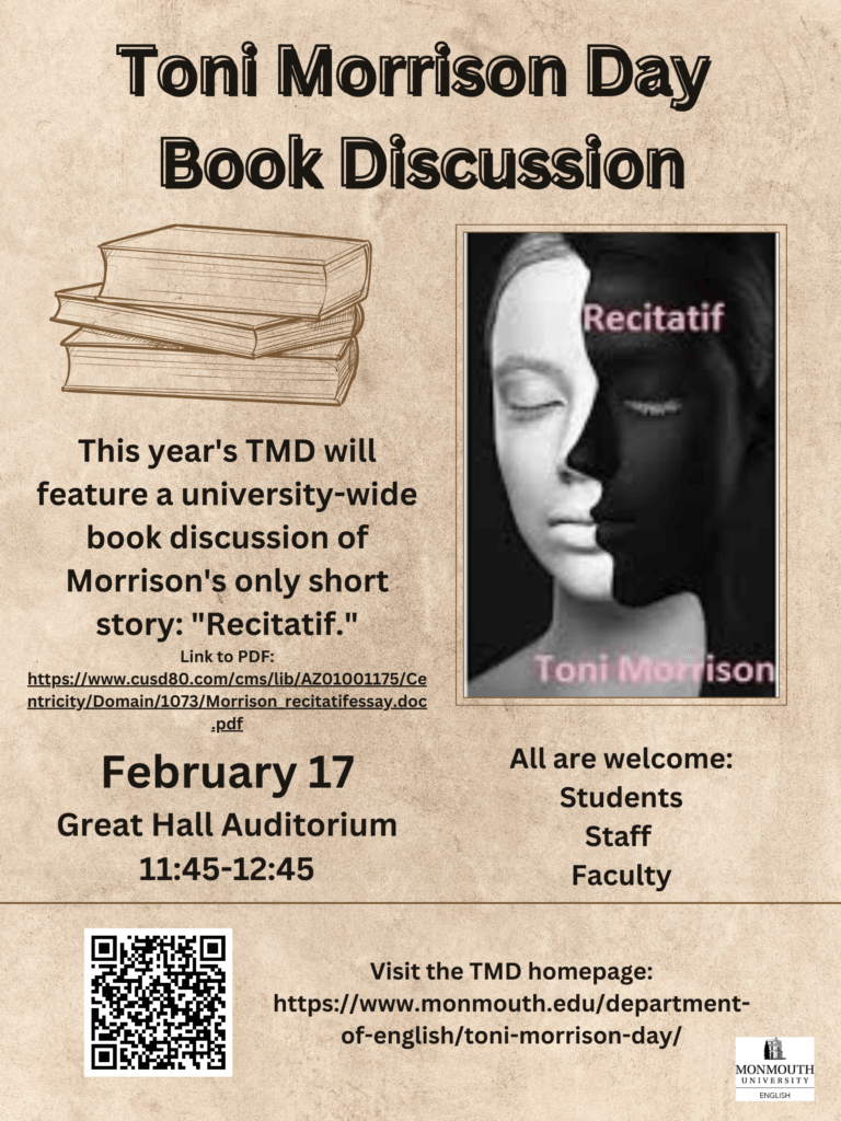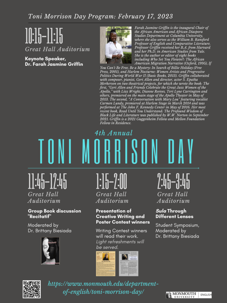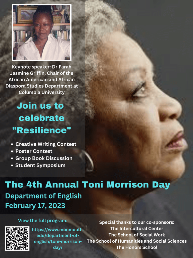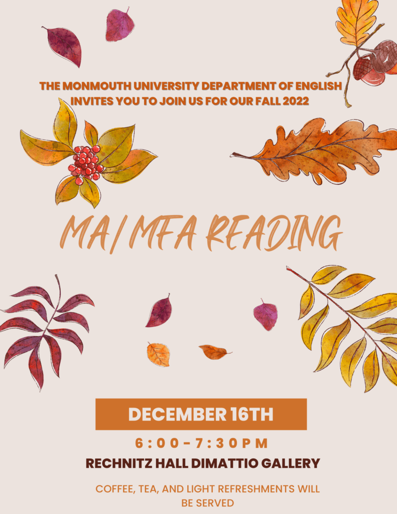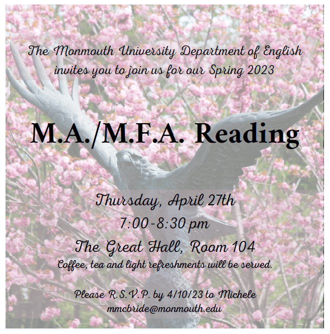 Monmouth Hawk Night – October 6, 2022Poetry Reading with Shara McCallum – October 19, 2022“So You (Might) Want To Go To Grad School” Seminar, December 7, 2022, 4:30-5:30pm on ZoomEnglish M.A./M.F.A. hosts “Throws and Prose”, November 11, 2022Monmouth Review Launch Party Issue #65 – December 1, 2022Welcome Pizza Party for Fall 2022 Inductees, December 9, 2022M.A./M.F.A. Reading – December 16, 20224th Annual Toni Morrison Day – February 17, 20234th Annual Toni Morrison Day Schedule – February 17, 20234th Annual Toni Morrison Day Keynote Speaker, Dr. Farah Jasmine Griffin – February 17, 20234th Annual Toni Morrison Day Book Discussion, February 17, 2023 4th Annual Toni Morrison Day Book Discussion, February 17, 2023March 25, 2023April 11, 2023April 13, 2023Sigma Tau Delta Induction Ceremony, April 20, 2023Monmouth Review Launch Party, Issue #66 – April 25, 2023M.A./M.F.A. Reading – April 27, 2023“A Multimodal Presentation of Victorian Giftbooks & Anthologies,” May 1, 2023