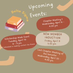 “A Multimodal Presentation of Victorian Giftbooks & Anthologies,” May 1, 2023Sigma Tau Delta Induction Ceremony, April 20, 2023Welcome Inductees!gotsneakers? Spring Fundraiser, April 10-24, 2023Welcome Pizza Party for Fall 2022 Inductees, December 9, 2022“So You (Might) Want To Go To Grad School” Seminar, December 7, 2022, 4:30-5:30pm on ZoomDouble Good Popcorn Fundraiser, December 6-10, 2022