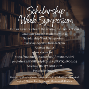 Wednesday, February 14, 2024, 4:00-9:00 p.m. at the Guggenheim Memorial LibraryGhost Stories in the Great Hall – December 12th, 5 PM, Great Hall Room 104Double Good Popcorn Fundraiser — December 4-8, 2023Halloween Bake Sale – October 31st, 12-2PM, Outside of the Student CenterSigma Tau Delta presents “Thinking of earning your M.A. or dual M.A.-M.F.A. Degree at Monmouth University,” October 18.