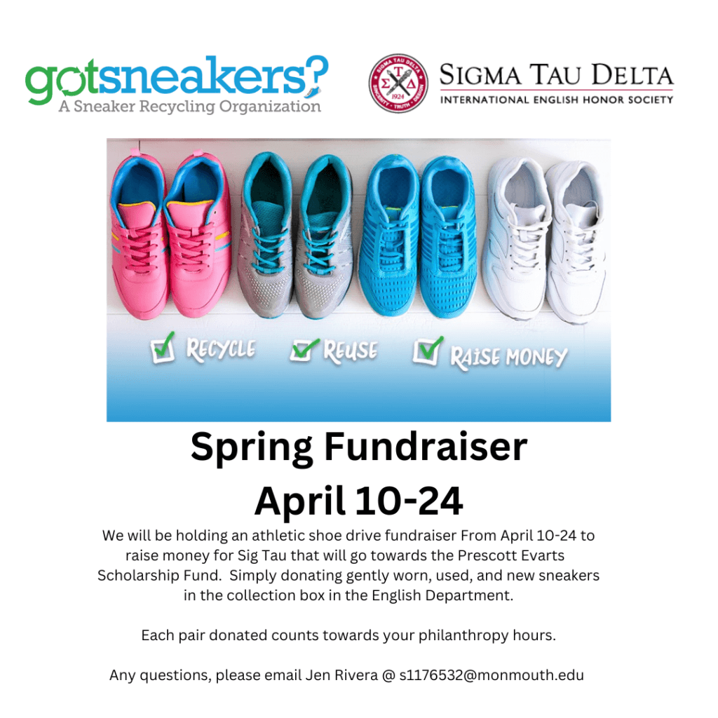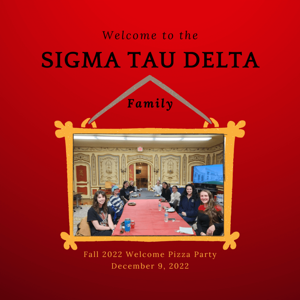 “A Multimodal Presentation of Victorian Giftbooks & Anthologies,” May 1, 2023Sigma Tau Delta Induction Ceremony, April 20, 2023Welcome Inductees!gotsneakers? Spring Fundraiser, April 10-24, 2023Welcome Pizza Party for Fall 2022 Inductees, December 9, 2022“So You (Might) Want To Go To Grad School” Seminar, December 7, 2022, 4:30-5:30pm on ZoomDouble Good Popcorn Fundraiser, December 6-10, 2022