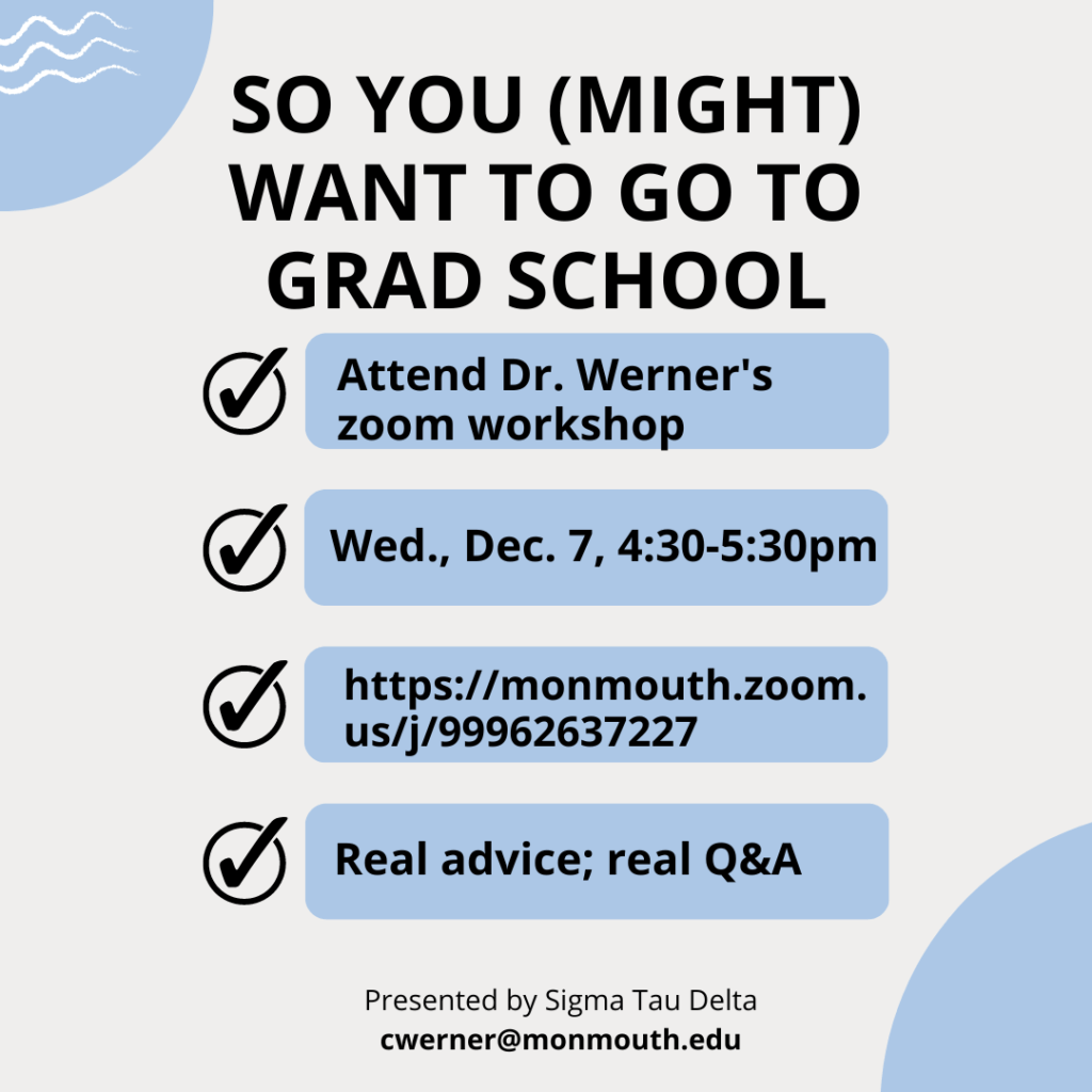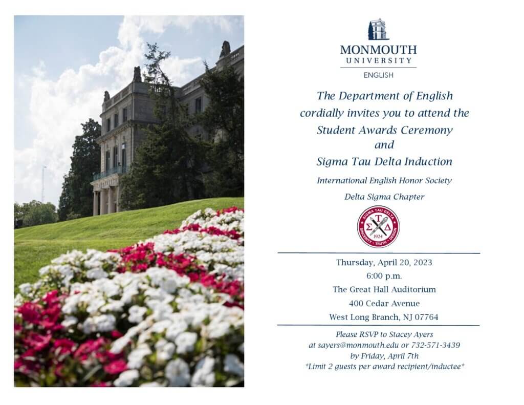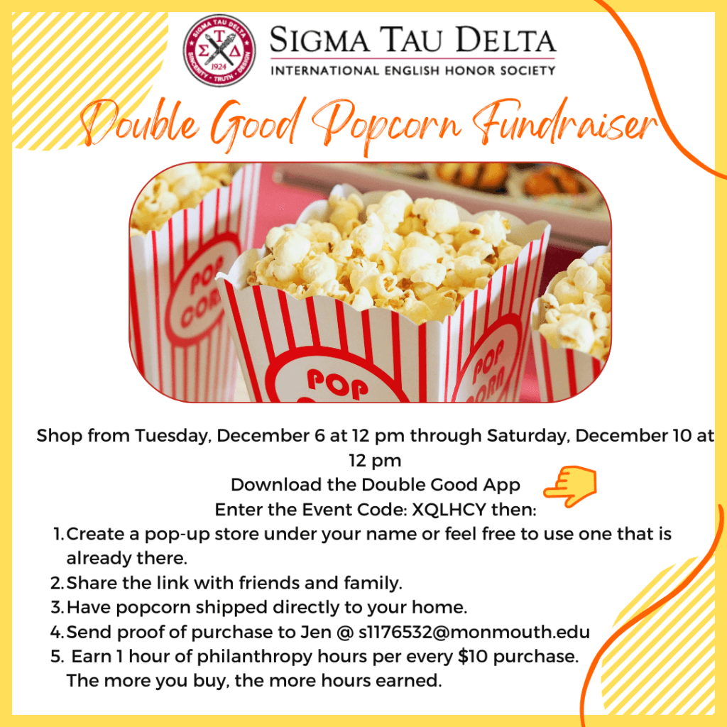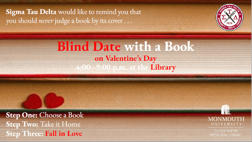 Wednesday, February 14, 2024, 4:00-9:00 p.m. at the Guggenheim Memorial LibraryGhost Stories in the Great Hall – December 12th, 5 PM, Great Hall Room 104Double Good Popcorn Fundraiser — December 4-8, 2023Halloween Bake Sale – October 31st, 12-2PM, Outside of the Student CenterSigma Tau Delta presents “Thinking of earning your M.A. or dual M.A.-M.F.A. Degree at Monmouth University,” October 18.