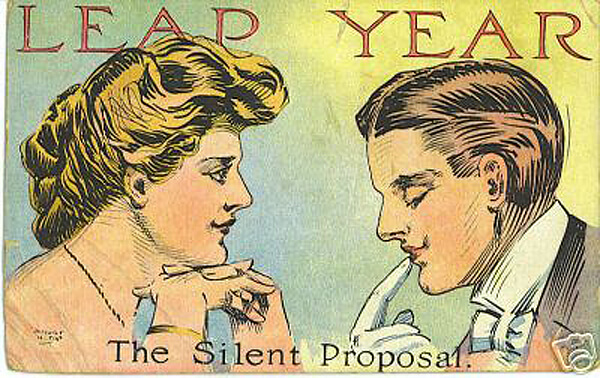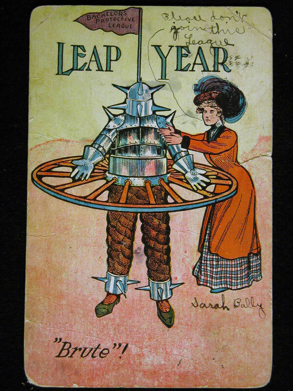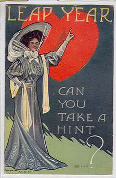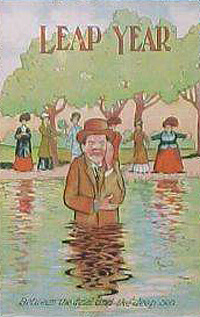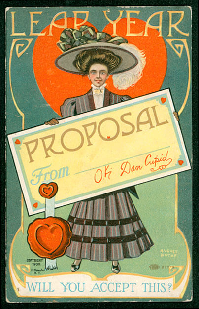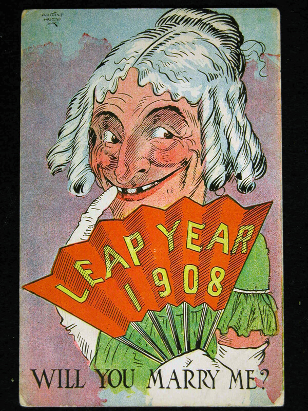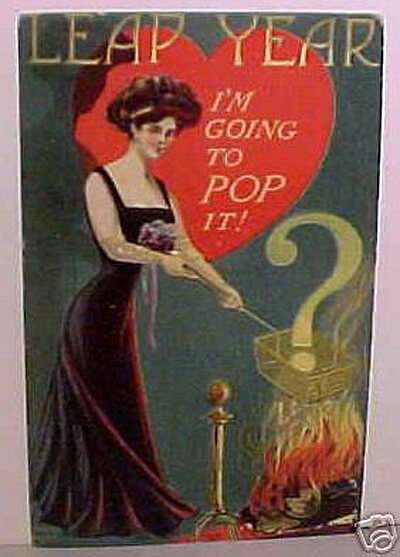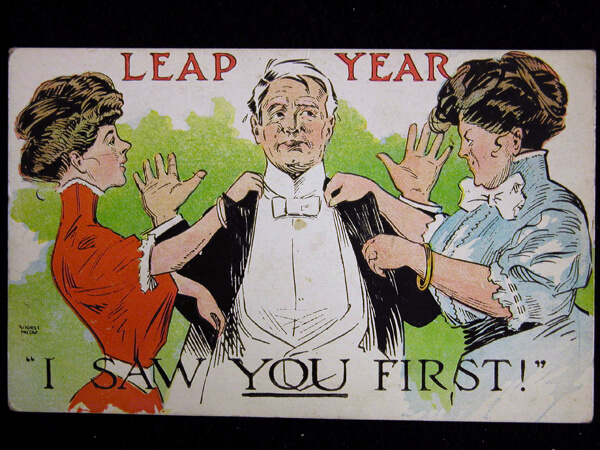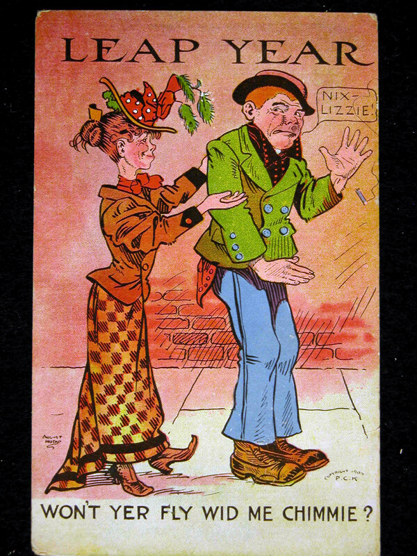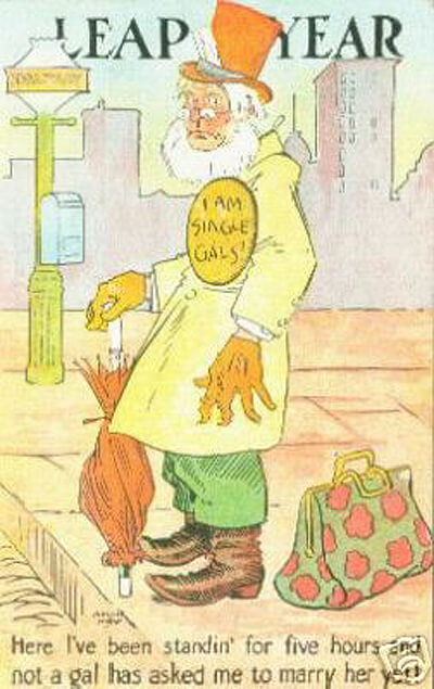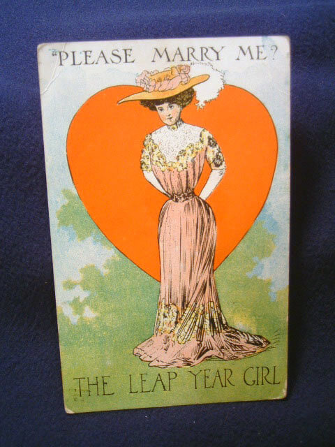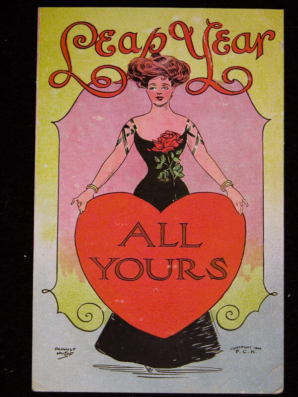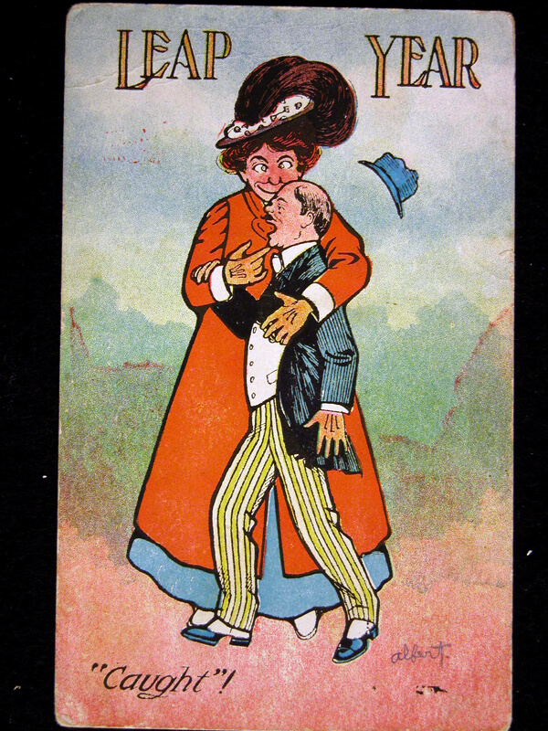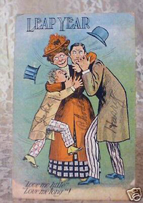 Use the available links at the end of this page to view an extensive collection of Leap Year postcards by year, artist, company, or overall theme.