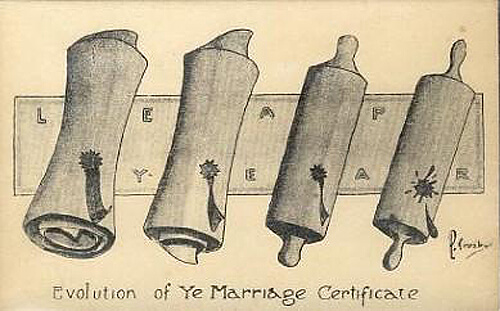 Use the available links at the end of this page to view an extensive collection of Leap Year postcards by year, artist, company, or overall theme.