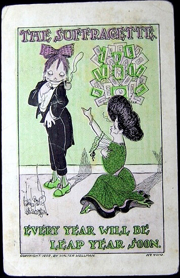 Use the available links at the end of this page to view an extensive collection of Leap Year postcards by year, artist, company, or overall theme.