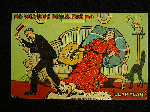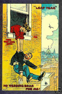 Use the available links at the end of this page to view an extensive collection of Leap Year postcards by year, artist, company, or overall theme.