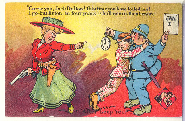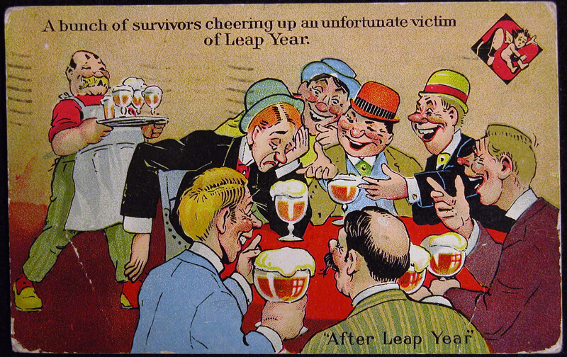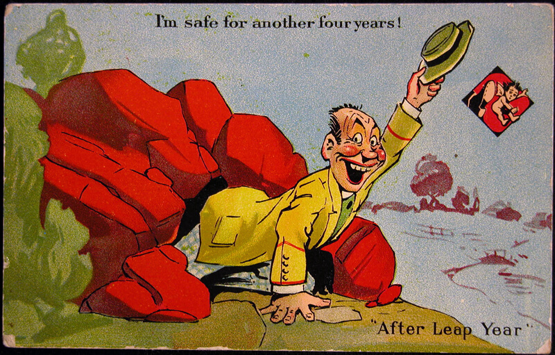 Use the available links at the end of this page to view an extensive collection of Leap Year postcards by year, artist, company, or overall theme.
