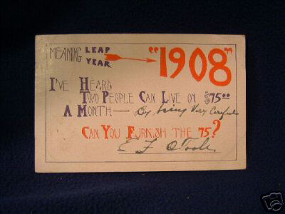 1908 Leap Year Postcard:: I’ve Heard Two People Can Live on $75 a Month.