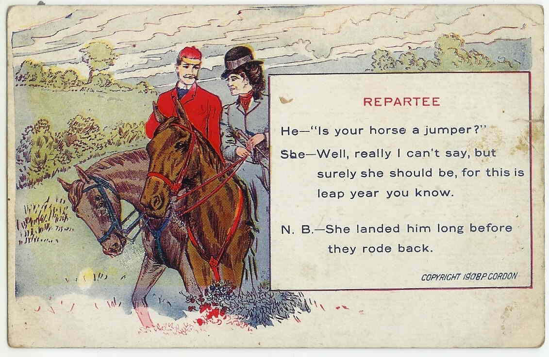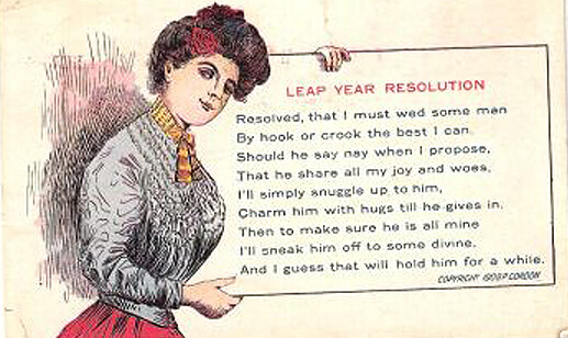 1908 Leap Year Postcard: “I know i’ll make you a kind loving wife, and by constant devotion, brighten your life, But why should I wait for you to ask me. When leap year’s my chance to propose to thee”