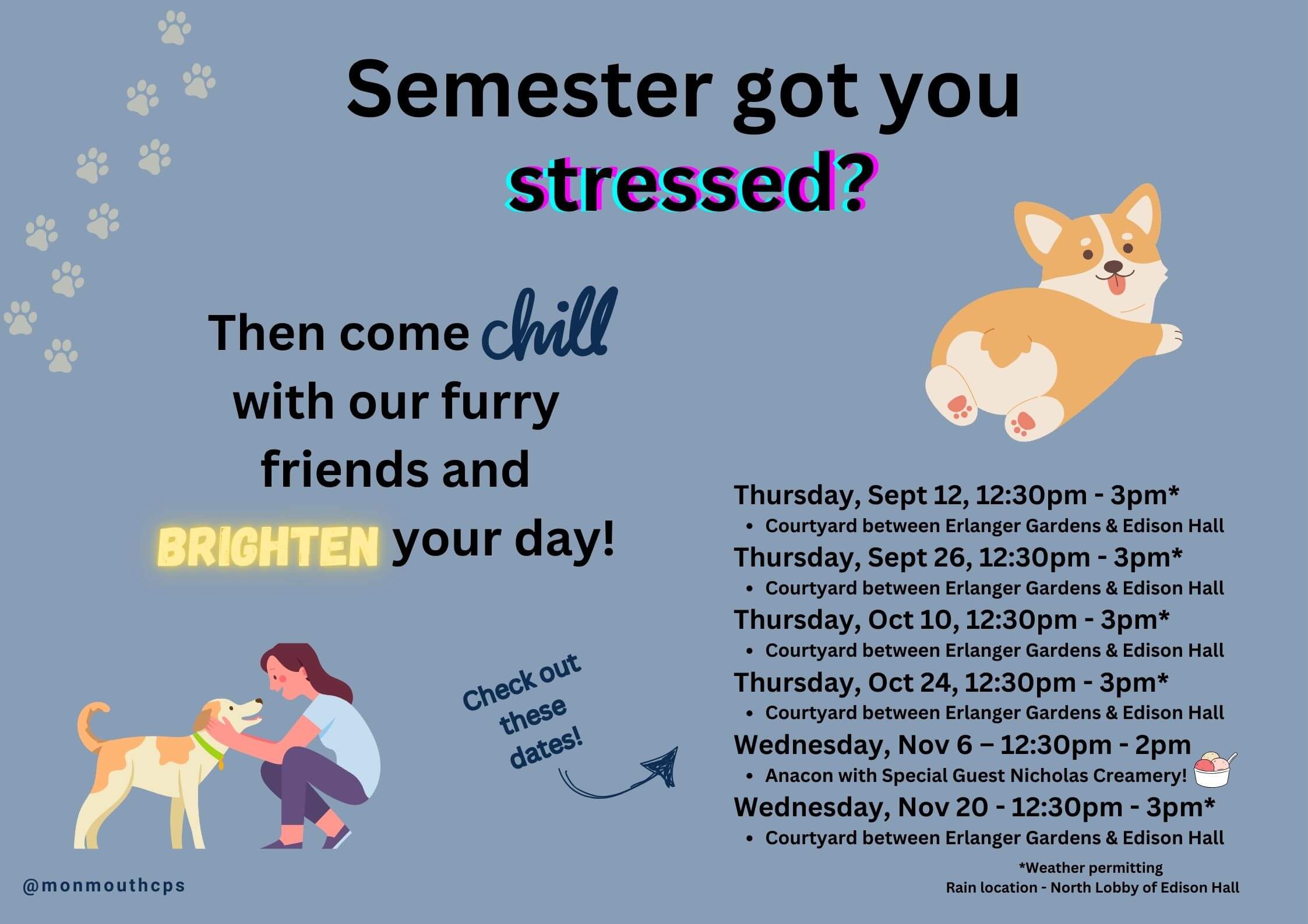 The CPS will be once again hosting the ever popular therapy dogs day from 12-3 pm in Erlanger Gardens.  Stop by, spend some time with the therapy dogs and unwind!