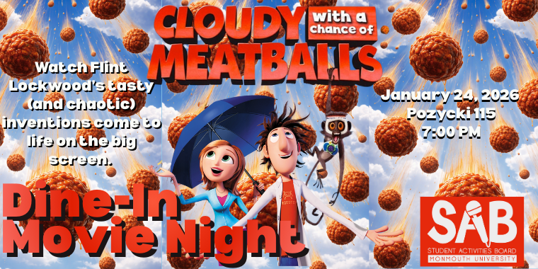 Watch Flint Lockwood’s tasty (and chaotic) inventions come to life on the big screen.n—nEvent Details: https://campusgroups.monmouth.edu/rsvp?id=375716