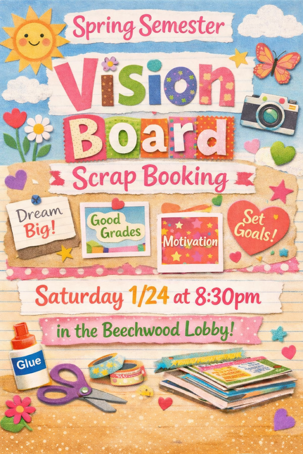 Residents can gather together to have a fun night of making a vision board for their semester goals.n—nEvent Details: https://campusgroups.monmouth.edu/rsvp?id=375798
