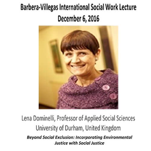 Barbera-Villegas International Social Work Lecture December 6, 2016 5:30 p.m., Wilson Hall Auditorium 5 p.m., Reception, Wilson Hall Auditorium Lobby Lena Dominelli, Professor of Applied Social Sciences, University of Durham, […]