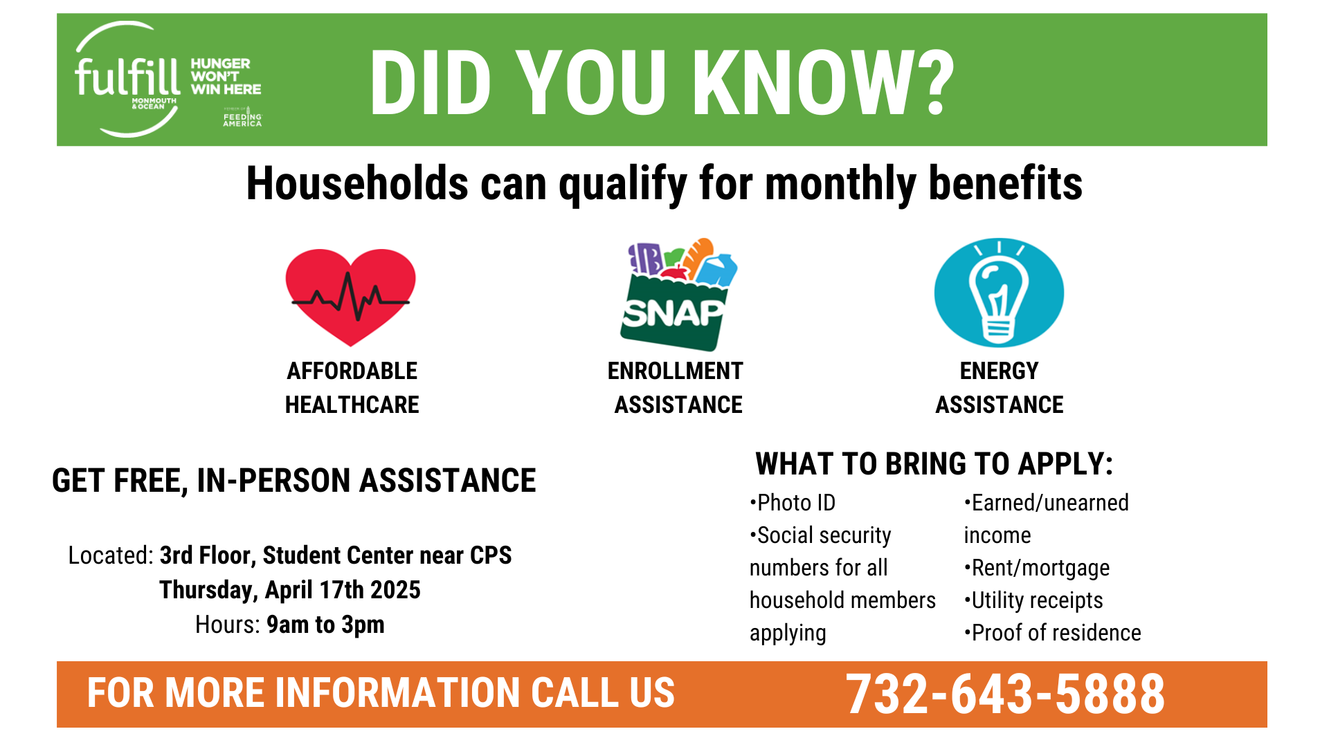 Are you unsure if you qualify for SNAP and Health Insurance? Fulfill NJ will be on campus this Thursday, April 17th from 9am-3pm on the 3rd Floor of the Student Center, near the […]