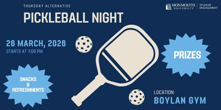 Sign into HawkHub to view the locationCome get your game on! Swing by Boylan Gym for an evening of pickleballs, snacks, refreshments and prizes.n—nEvent Details: https://campusgroups.monmouth.edu/rsvp?id=375670