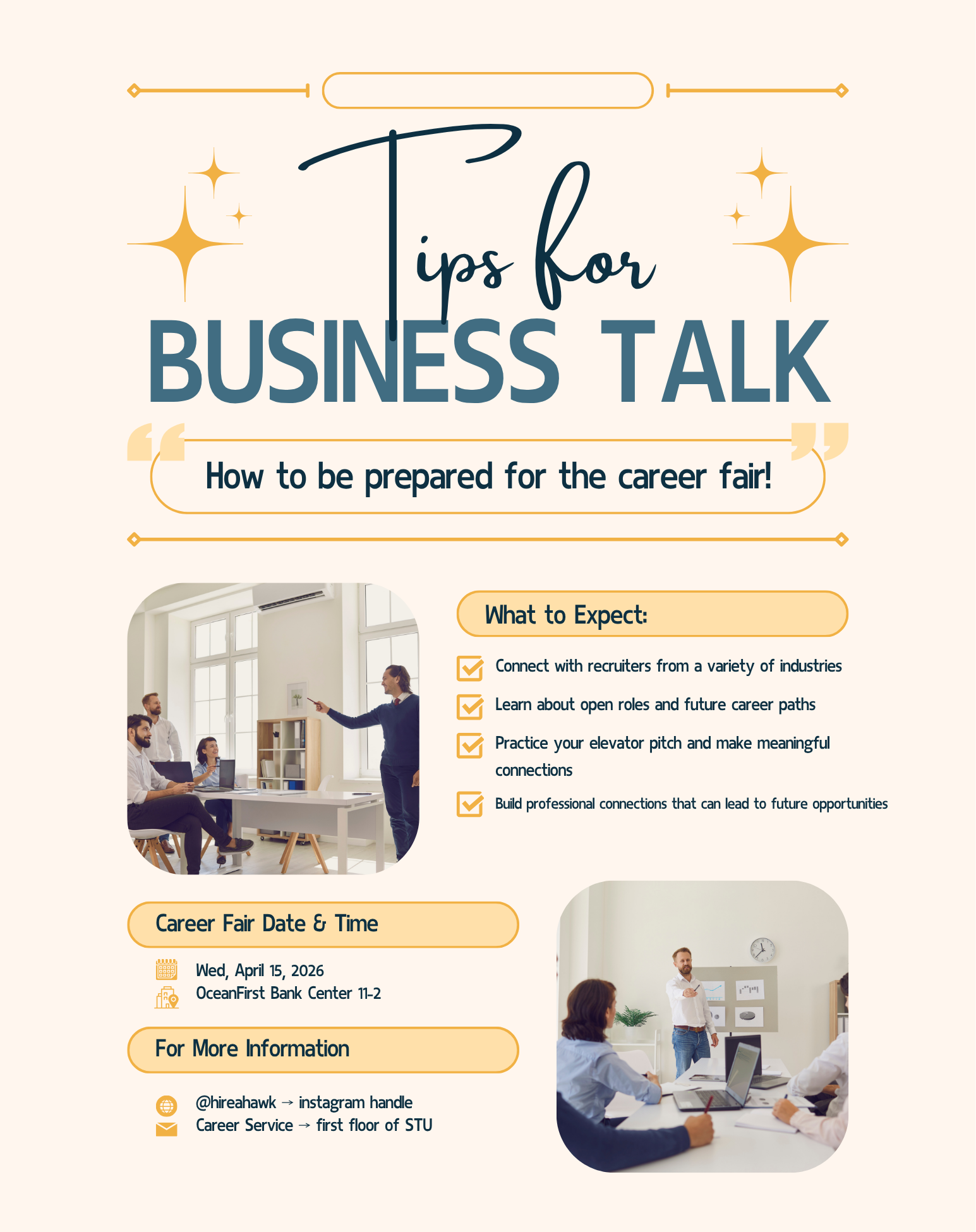 Handing out flyers that have tips and tricks for the upcoming career fair as well as answering any questions! n—nEvent Details: https://campusgroups.monmouth.edu/rsvp?id=376097