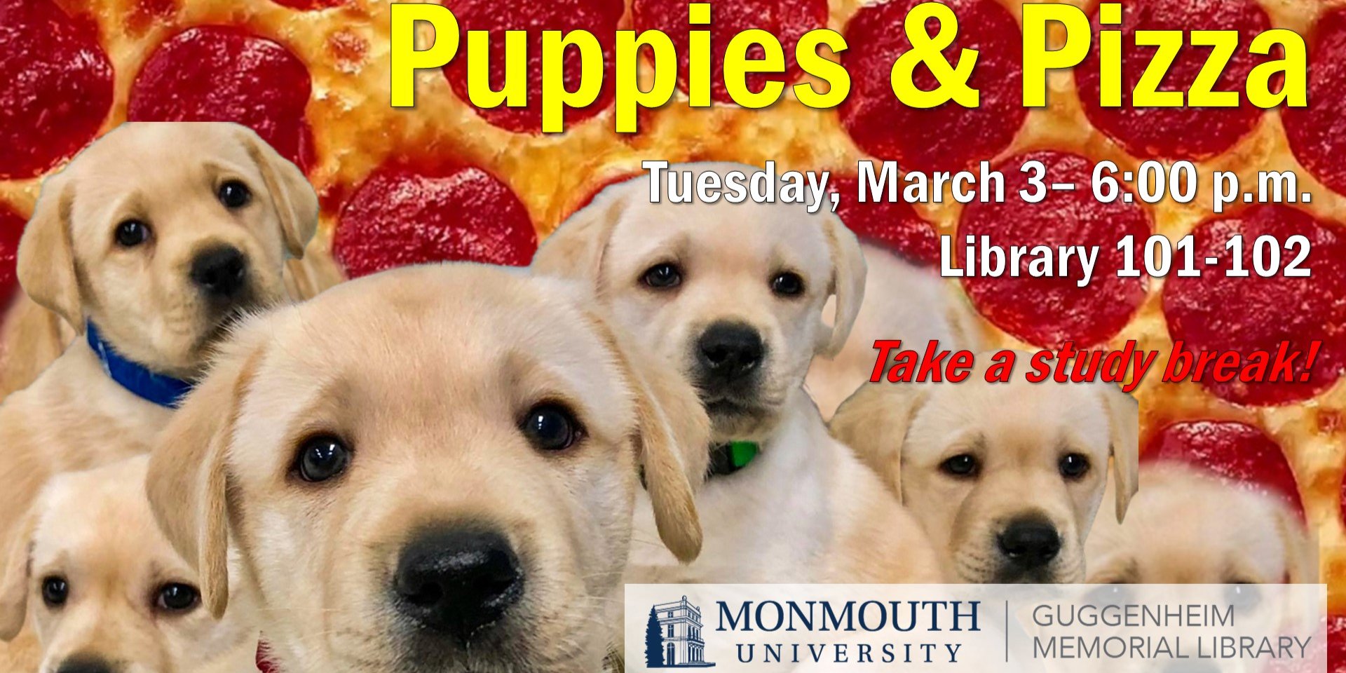 Service dog puppies in training will be visiting the Library and you’re invited to come and pet them! Enjoy some pizza as well.n—nEvent Details: https://campusgroups.monmouth.edu/rsvp?id=375835