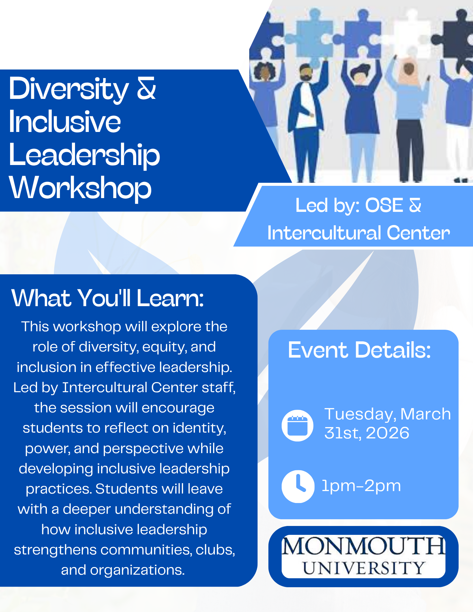 This workshop will explore the role of diversity, equity, and inclusion in effective leadership. Led by Intercultural Center staff, the session will encourage students to reflect on identity, power, and […]