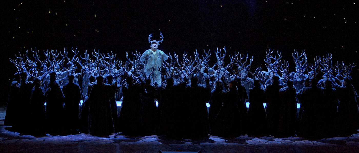 Verdi’s Shakespearean comedy features a brilliant ensemble cast in Robert Carsen’s celebrated staging. Baritone Michael Volle sings his first Verdi role at the Met as the caddish knight Falstaff, gleefully tormented by a trio of clever women who deliver his comeuppance. Reuniting after their acclaimed performances in the production’s 2019 run are soprano Ailyn Pérez as Alice Ford, soprano Jennifer Johnson Cano as Meg Page, and mezzo-soprano Marie-Nicole Lemieux as Mistress Quickly. Soprano Hera Hyesang Park and tenor Bogdan Volkov are the young couple Nannetta and Fenton, and Daniele Rustioni conducts.