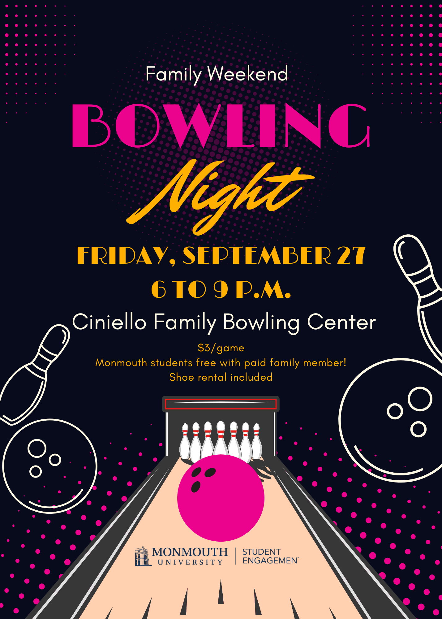 Spare, strike, or turkey….bowl right here on campus! Cost is $3/game and Monmouth students are free with a paid family member. Shoe rental is included.