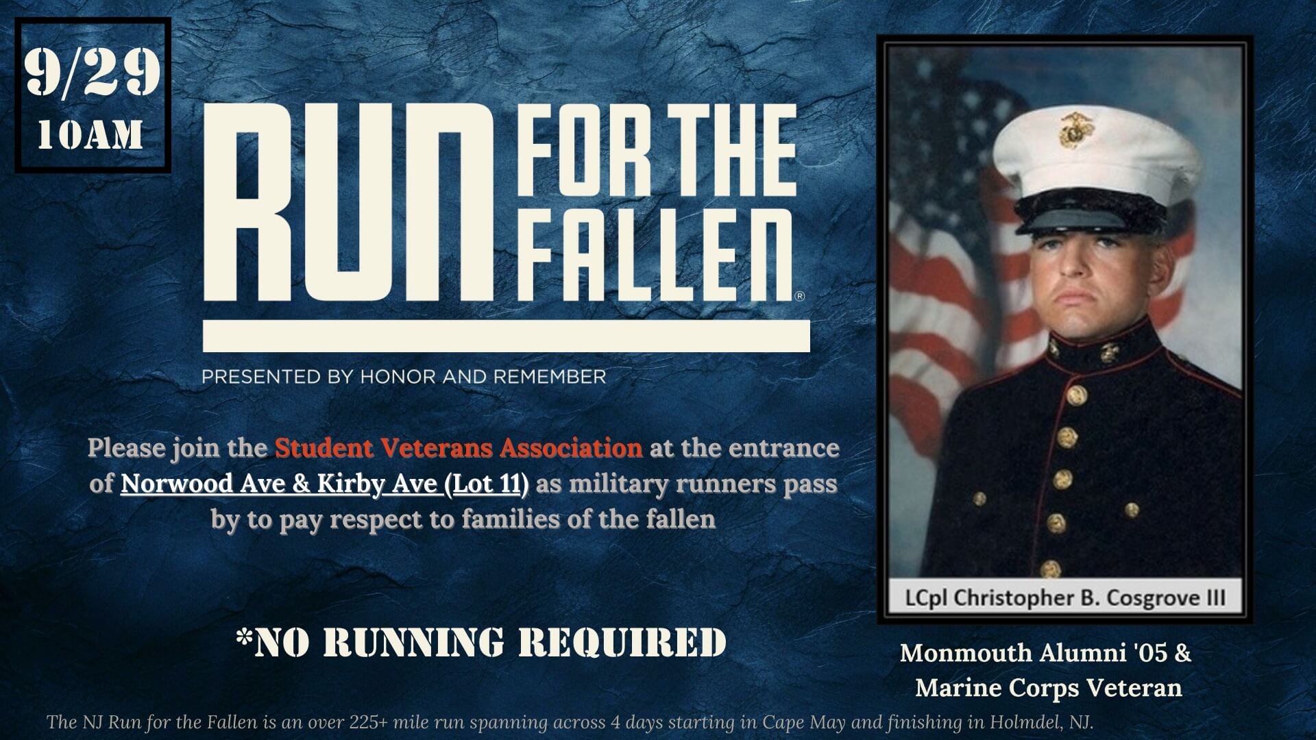 Please join the Student Veterans Association at the entrance of Norwood Ave & Kirby Ave (Lot11) for the 16th annual NJ Run for the Fallen. There is no running required to participate! The NJ Run for the Fallen has teams of military runners who embark on a 225+ mile journey starting in Cape May and […]