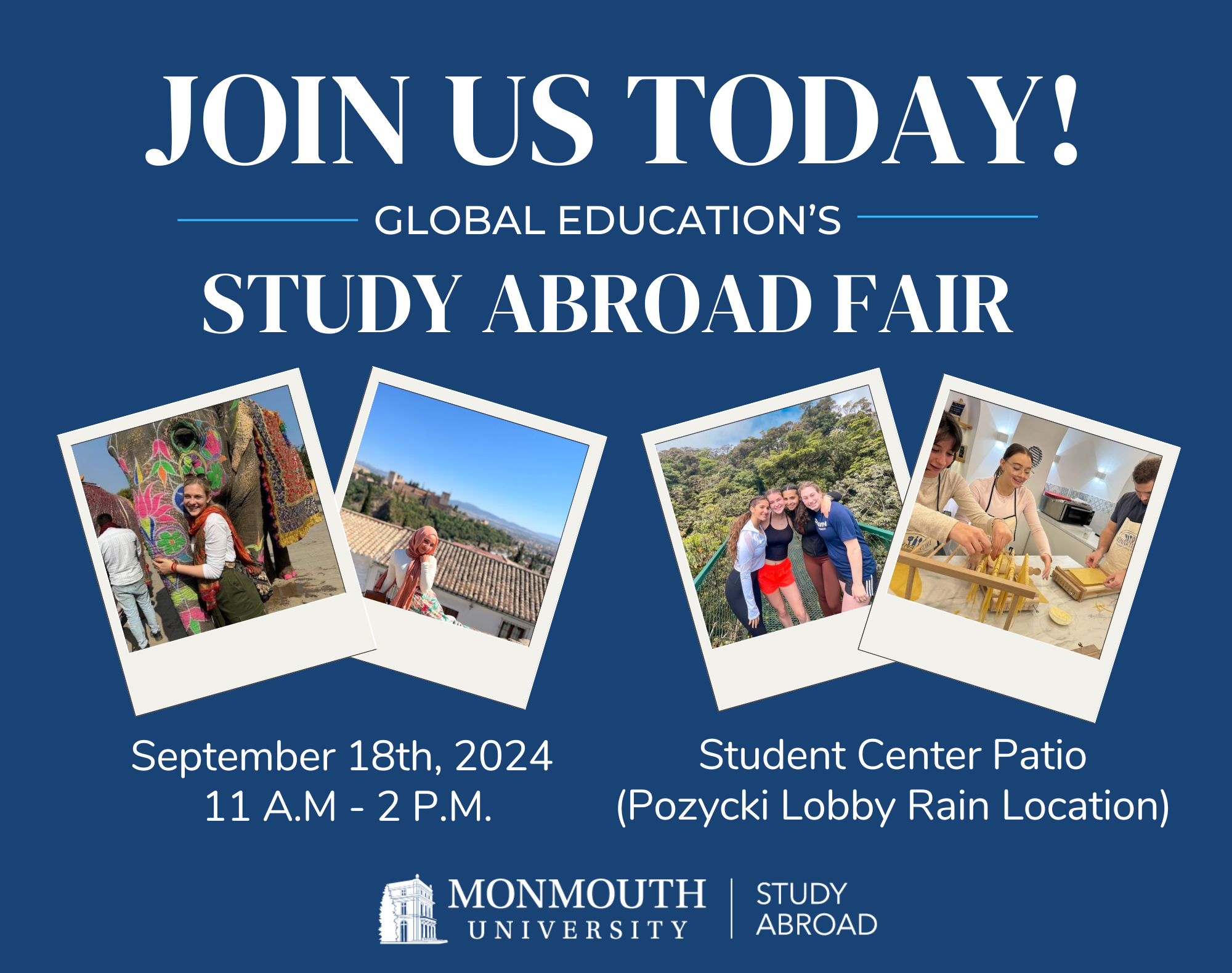 Join us for the annual study abroad fair to learn about all the amazing signature and faculty-led programs Monmouth University has to offer! Rain Location: Pozycki Hall Lobby