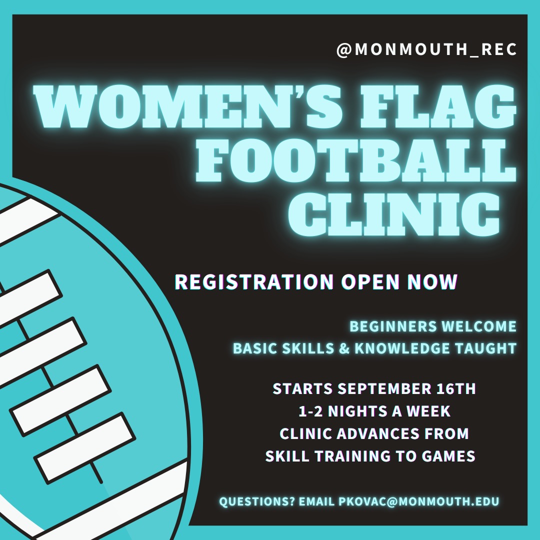 Monmouth Recreation will be offering a Women’s Flag Football Clinic. Clinics open to all girls of any skill level! We will teach you flag football skills, knowledge and strategy, and students will have the opportunity to play actual games. Our clinics are an awesome way to meet people and make new friends on campus! Additionally, […]