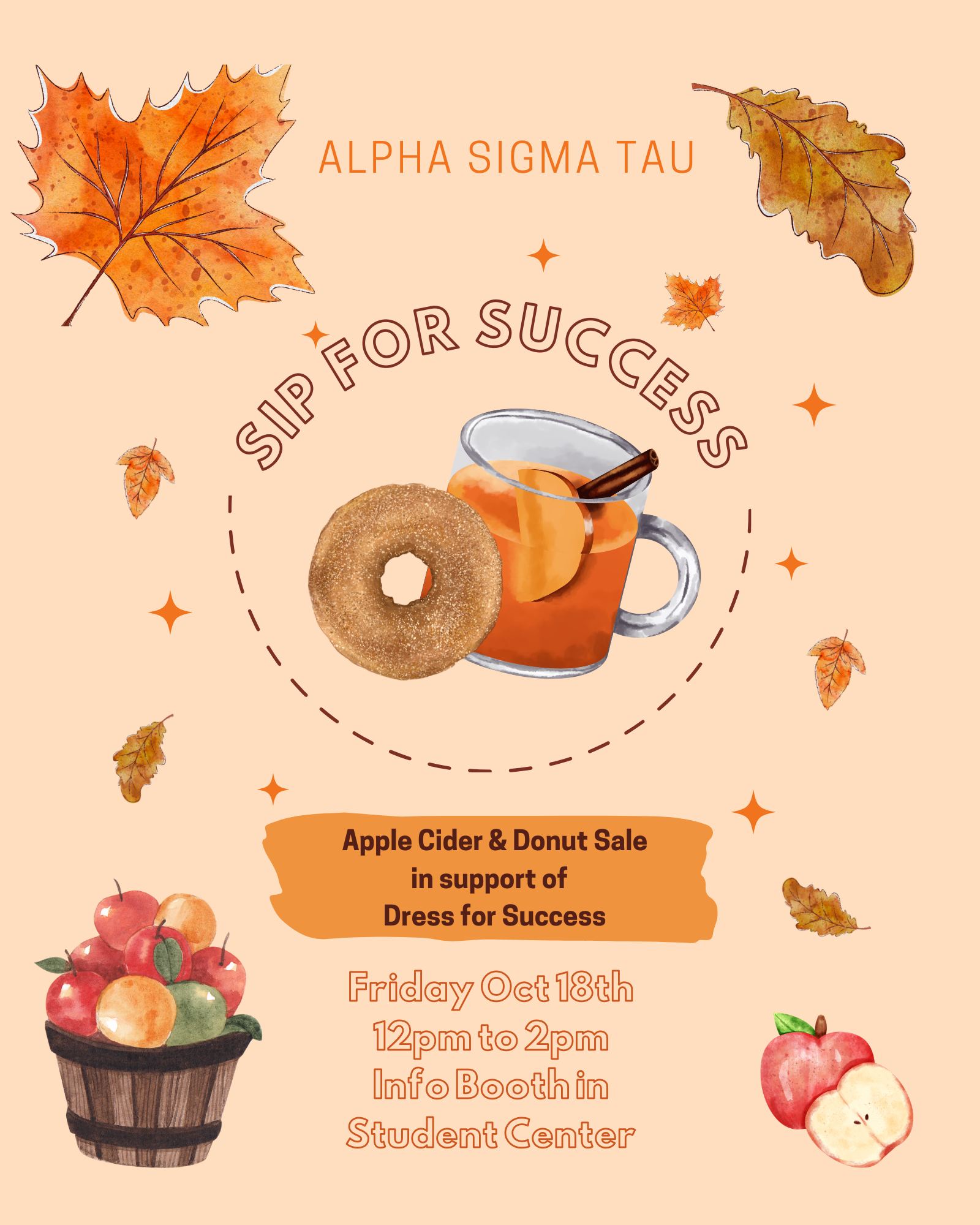 Tabling event hosted by Alpha Sigma Tau to raise money for one of the organizations, Dress for Success, that is partnered with our national philanthropy, The Women’s Wellness Initiative. We will be selling cups of apple cider and donuts.