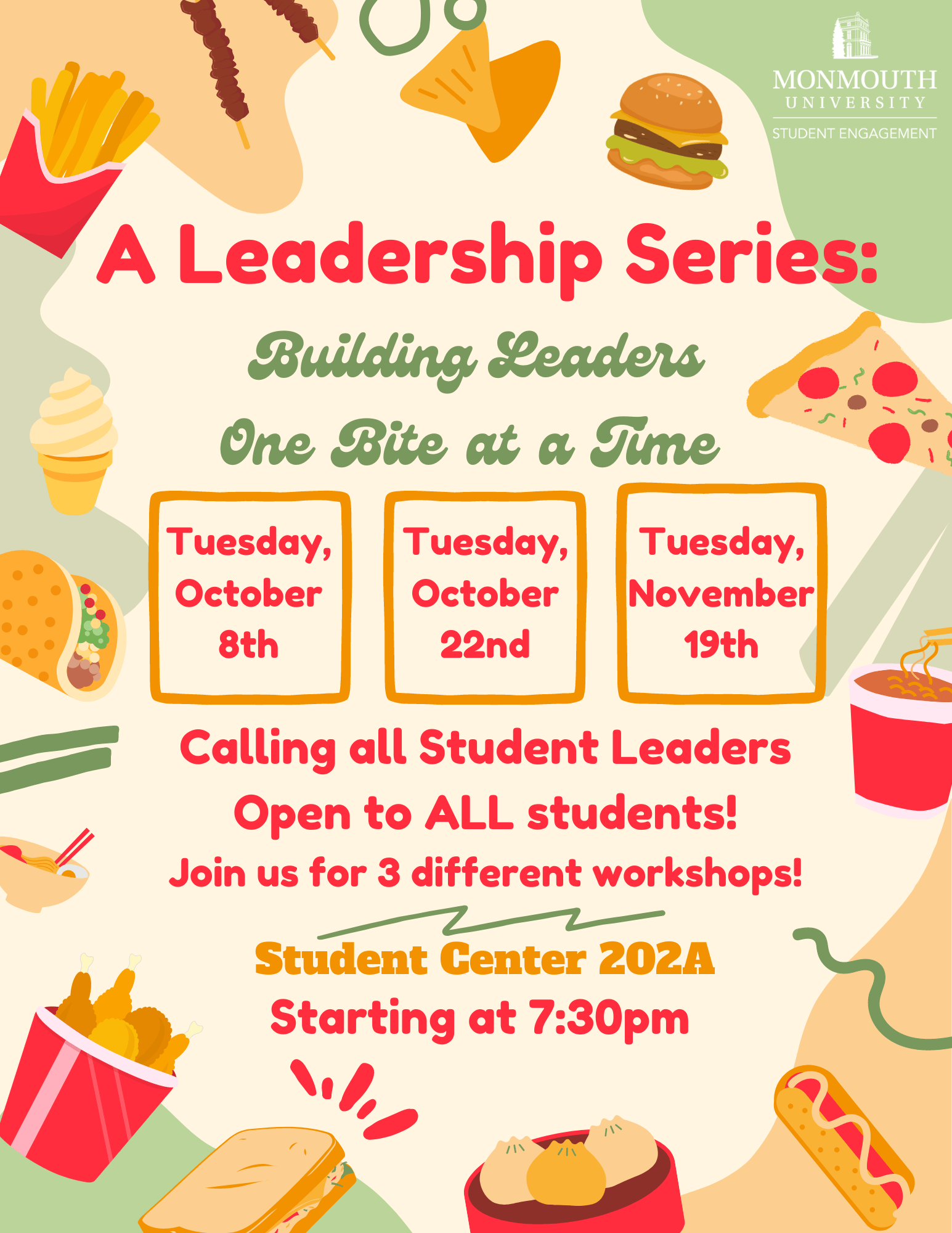 Calling all student leaders! Join us for 3 different leadership workshops all centered around everyone’s favorite – FOOD! Events open to all students. Events in Student Center Room 202A