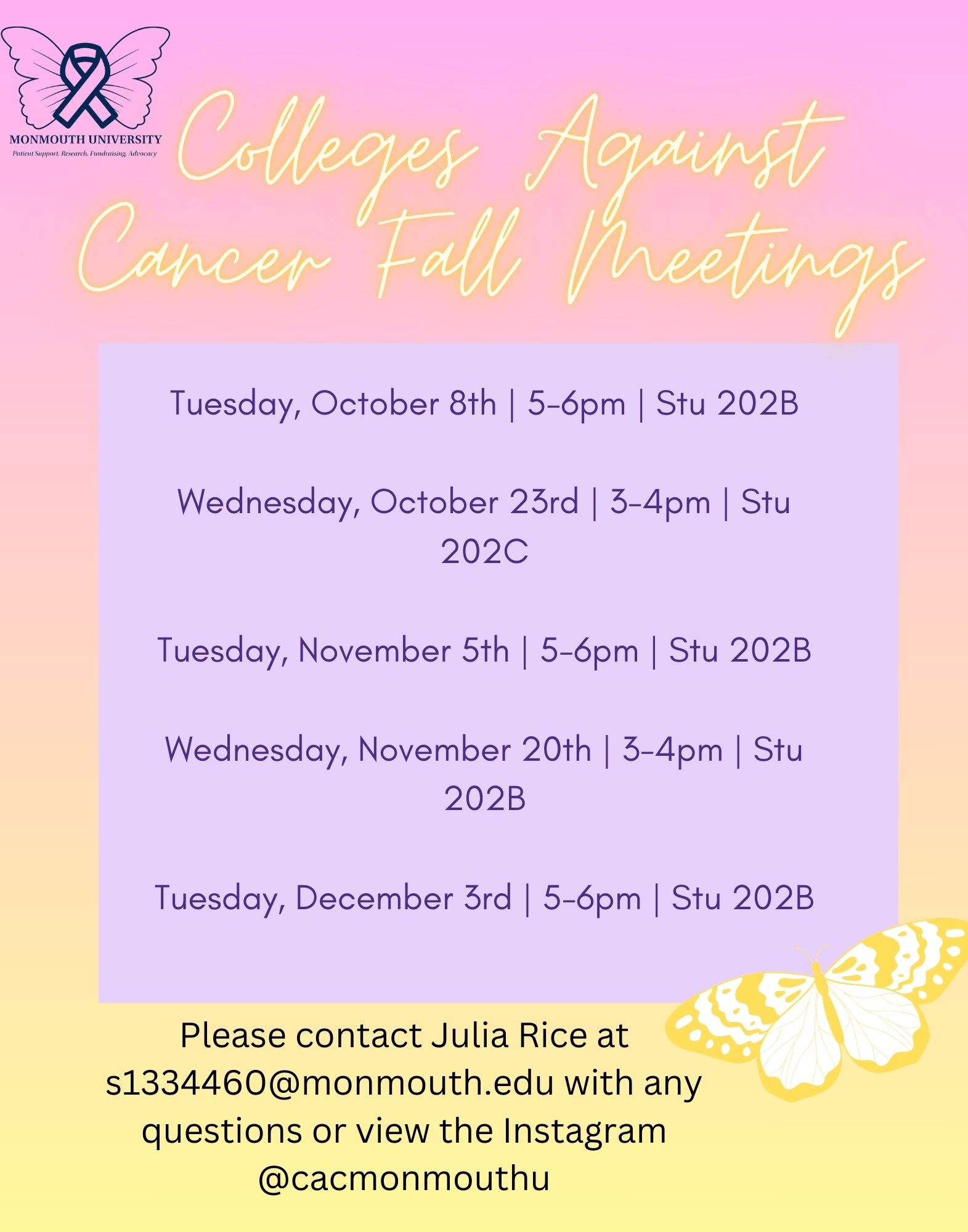 Colleges Against Cancer is accredited by the American Cancer Society, whose competencies include research, fundraising, advocacy for cancer awareness. We support those at Monmouth University and surrounding areas with different events hosted in and around campus, as well as co-sponsoring with other organizations on and off campus. …
