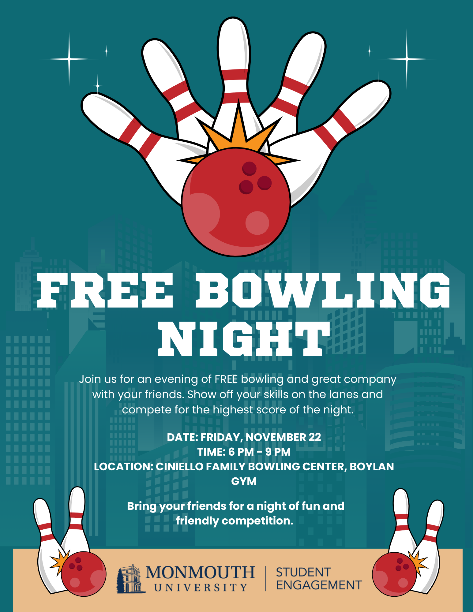 Join us for an evening of FREE bowling and great company with your friends. Show off your skills on the lanes and compete for the highest score of the night. Friday, November 22 from 6-9 pm at the Ciniello Family Bowling Center, Boylan Gym.