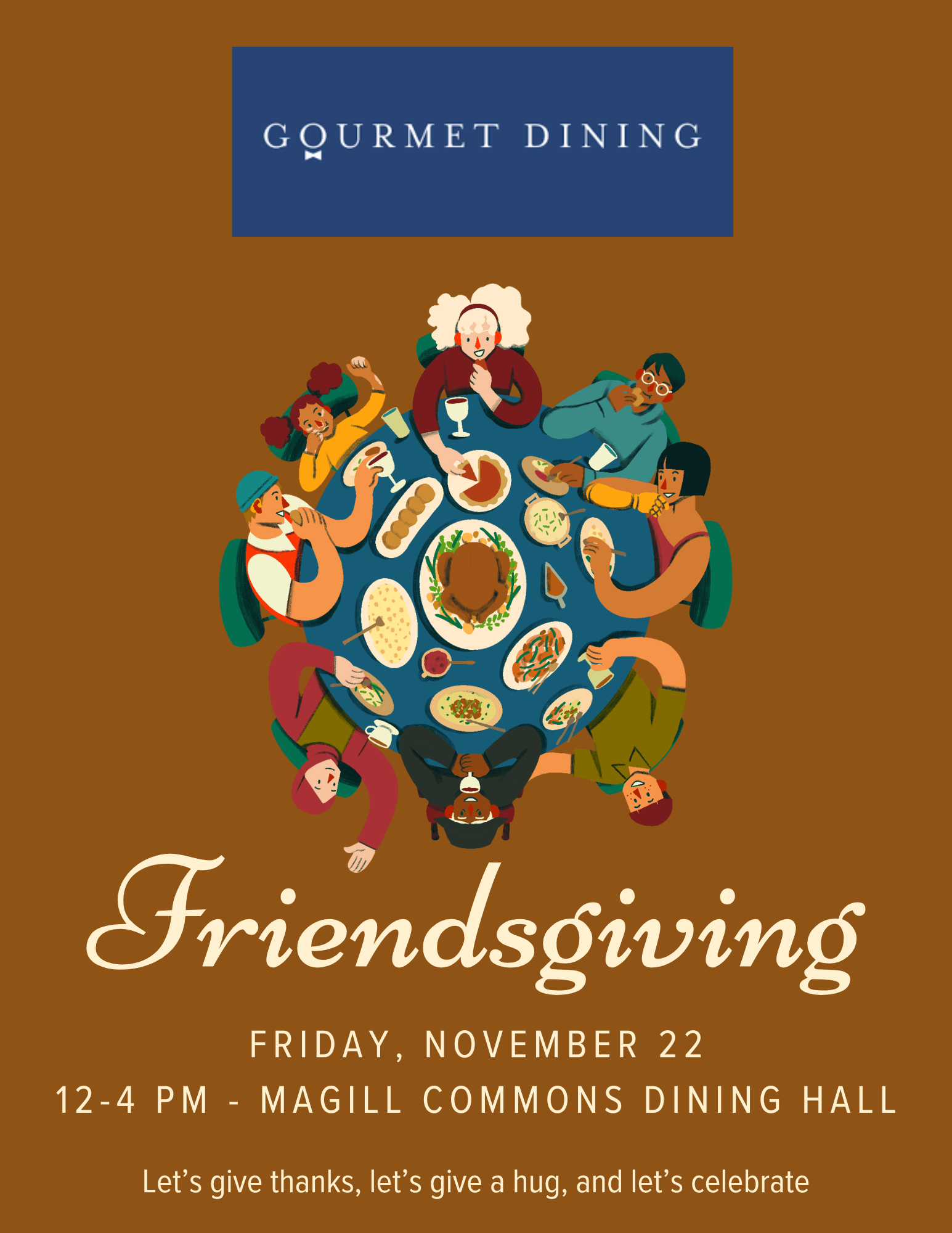 With Thanksgiving right around the corner, Gourmet Dining is hosting the ever popular Friendsgiving on Friday, November 22 from 12-4 pm at Magill Commons Dining Hall. $10 for students who do not have a meal plan.