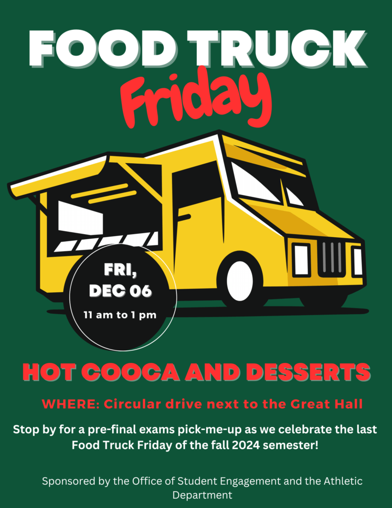 The end of the semester may have arrived but that doesn’t mean we can’t celebrate its ending. Stop by the circular drive next to the Great Hall on Friday, December 6 from 11 am to 1 pm for our final edition of Food Truck Friday of the fall 2024 term. We will be featuring hot cocoa and desserts. Event is being sponsored by the Office of Student Engagement and the Athletic Department.