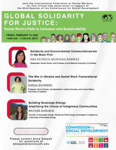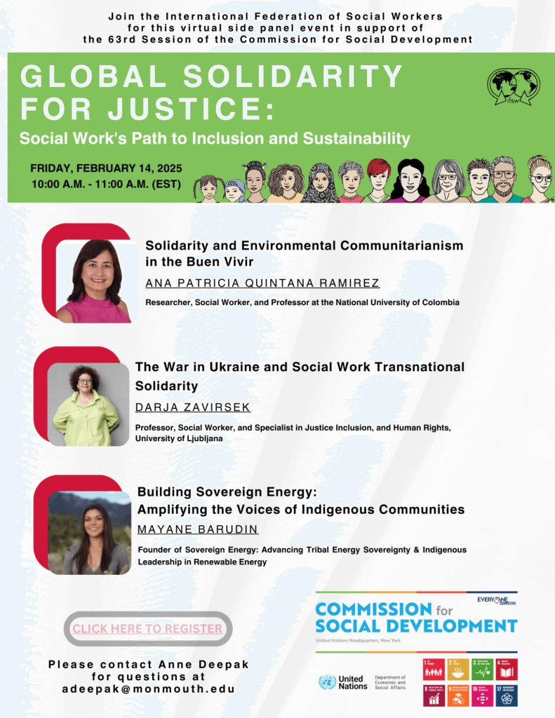 This session explores community-driven strategies for advancing social justice and sustainable development grounded in collective care for each other and the planet to promote a sustainable and just future. Guest speakers include Professor Darja Zaviršek, Ph.D. from the University of Ljubljana, Faculty of Social Work who will speak on the war in Ukraine and social work transnational solidarity and Dr. Ana Patricia Quintana Ramírez, Profesora Asociada de la Universidad Nacional de Colombia who will speak community-led resource management and Buen Vivir. Finally, we will be joined by guest speaker Mayane Chavez Barudin, a Tribal member of Kewa (Santo Domingo) Pueblo in New Mexico, and founder of the nonprofit Sovereign Energy. Mayane will speak on the topic of enabling economic prosperity and environmental justice for her community and Indigenous peoples by advocating for an inclusive clean energy transition.