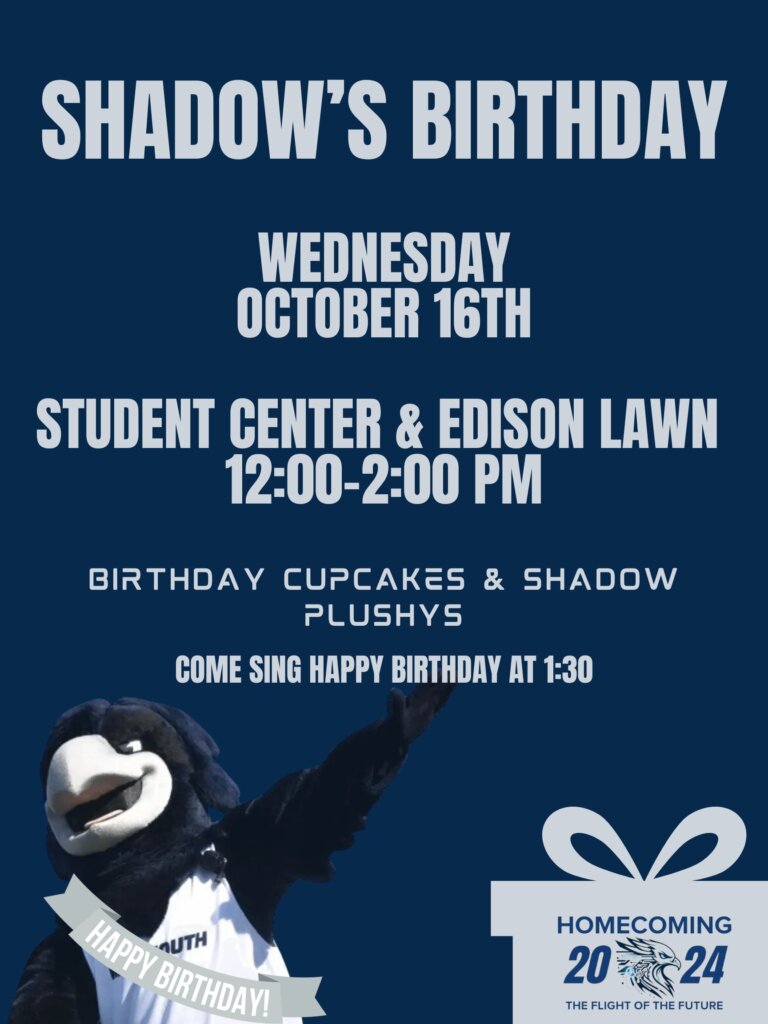 Join SGA as we kick off the week of Homecoming with a celebration of Shadow’s Birthday! We’ll have free blue and white cupcakes (while they last) and Shadow will be on hand as we wish him a very Happy Birthday. Fly Hawks!
